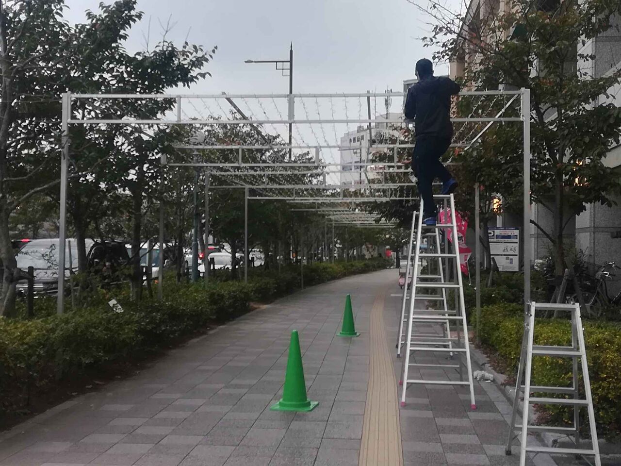 今年は少し早い準備のようです。昨年もあったアクトアモーレのJR高槻駅沿いのイルミネーション 光のカーテンの準備が始まっているようです。