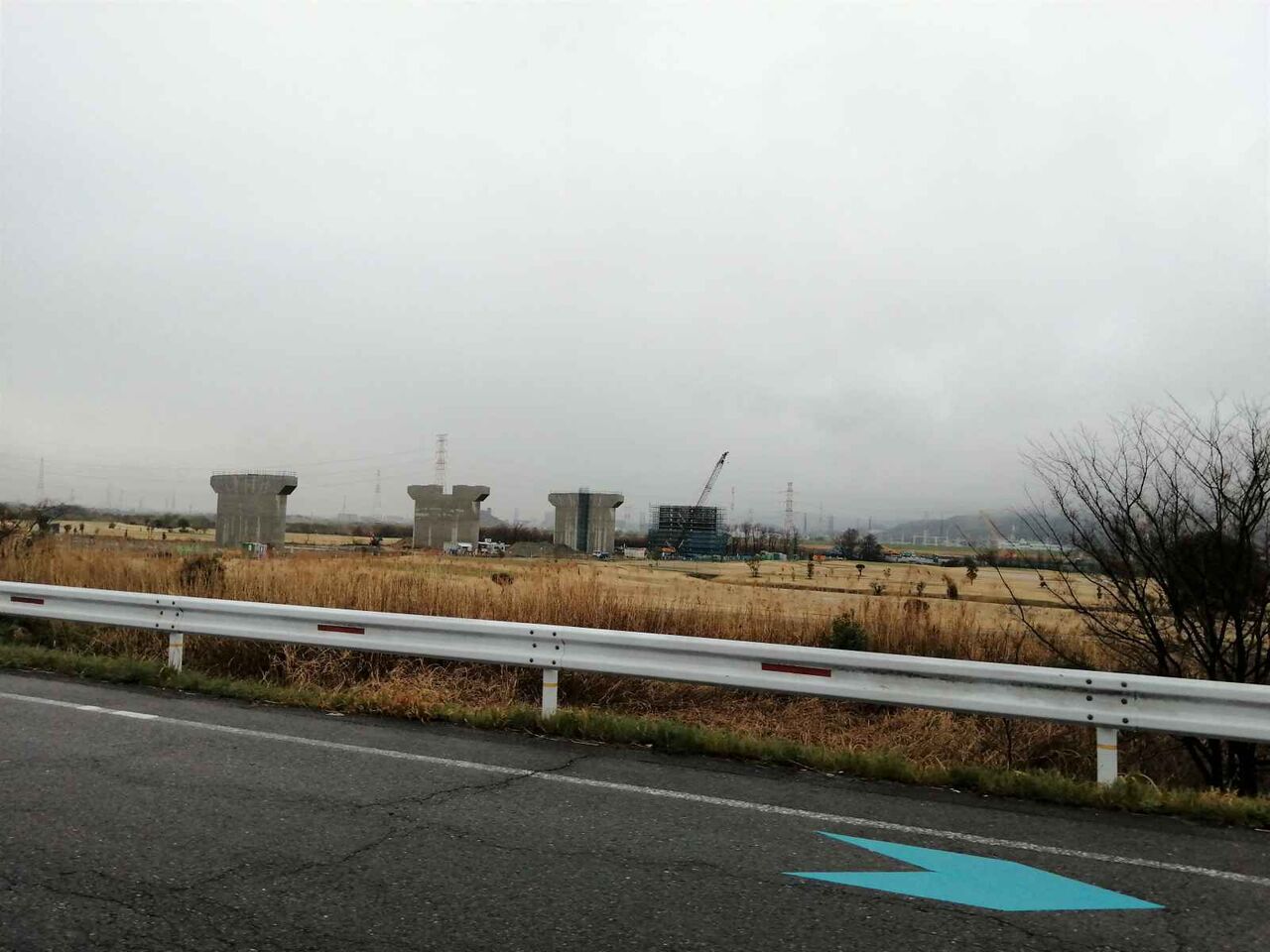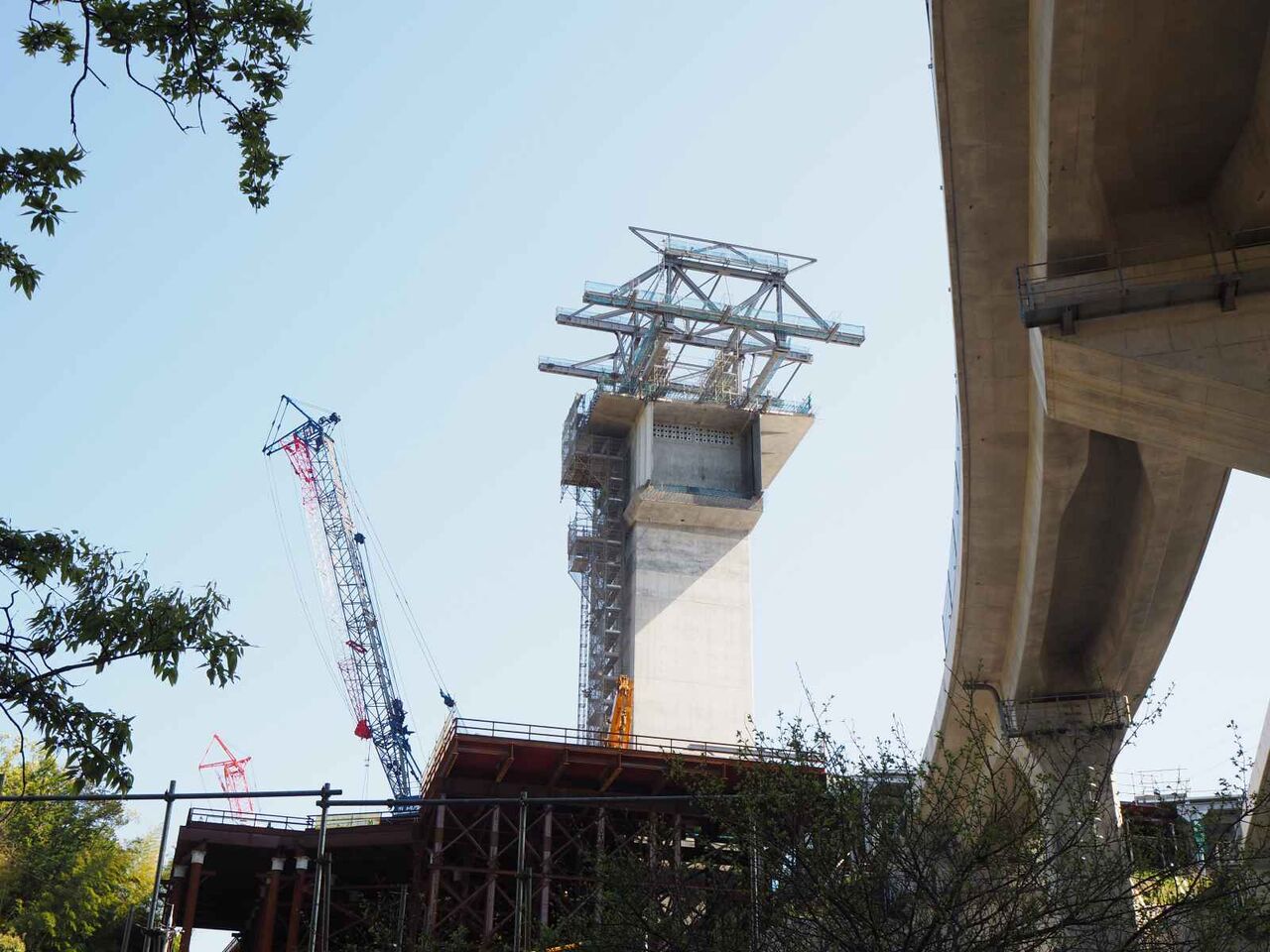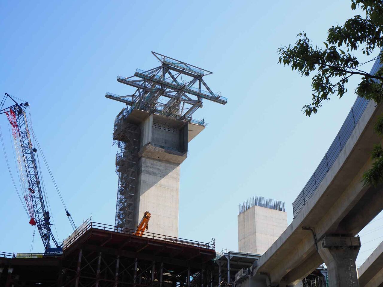 左手の橋脚が上までできてこれから両側に橋梁を伸ばしていく工事になると思われます。