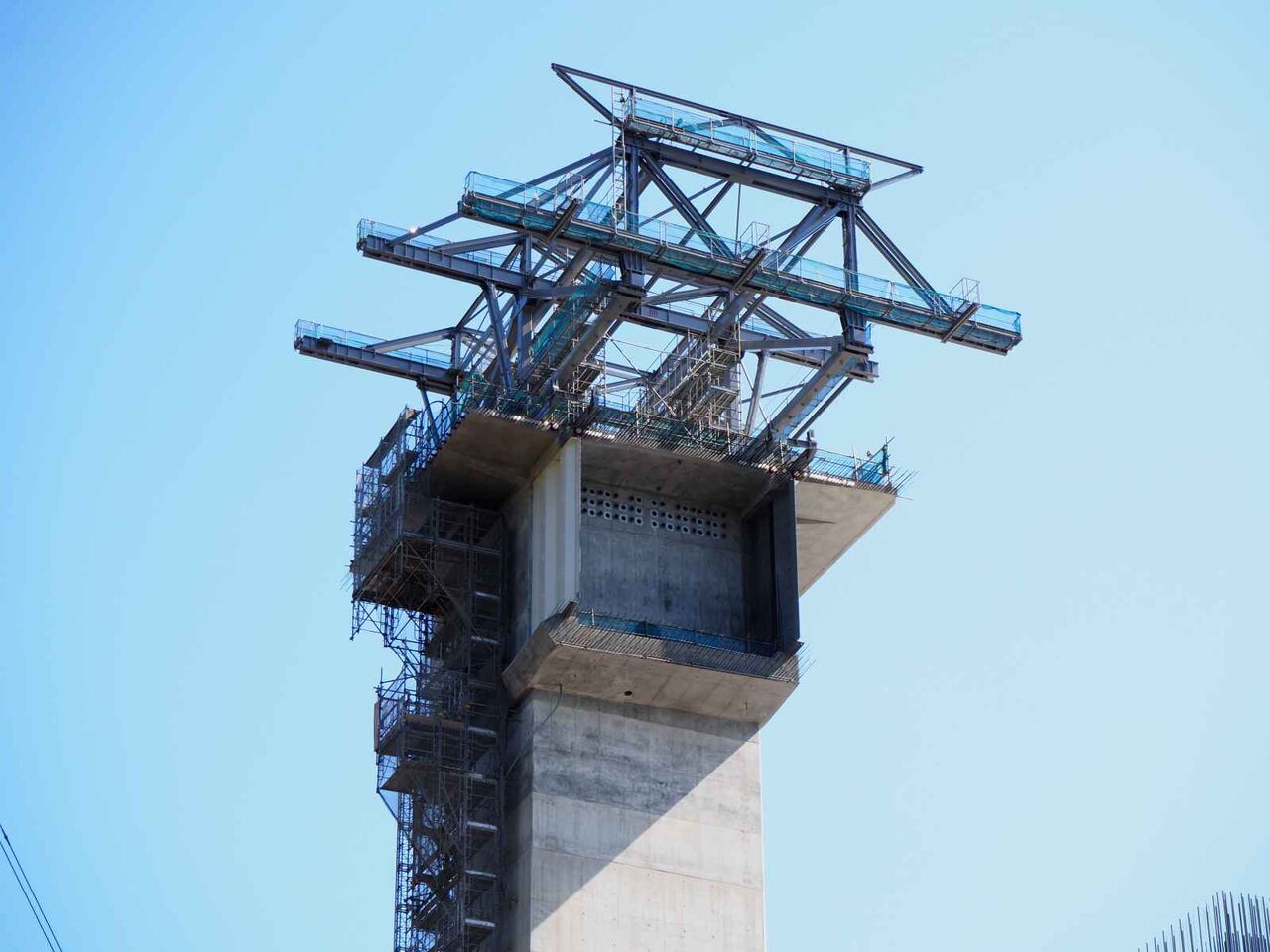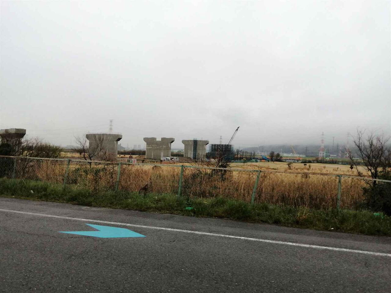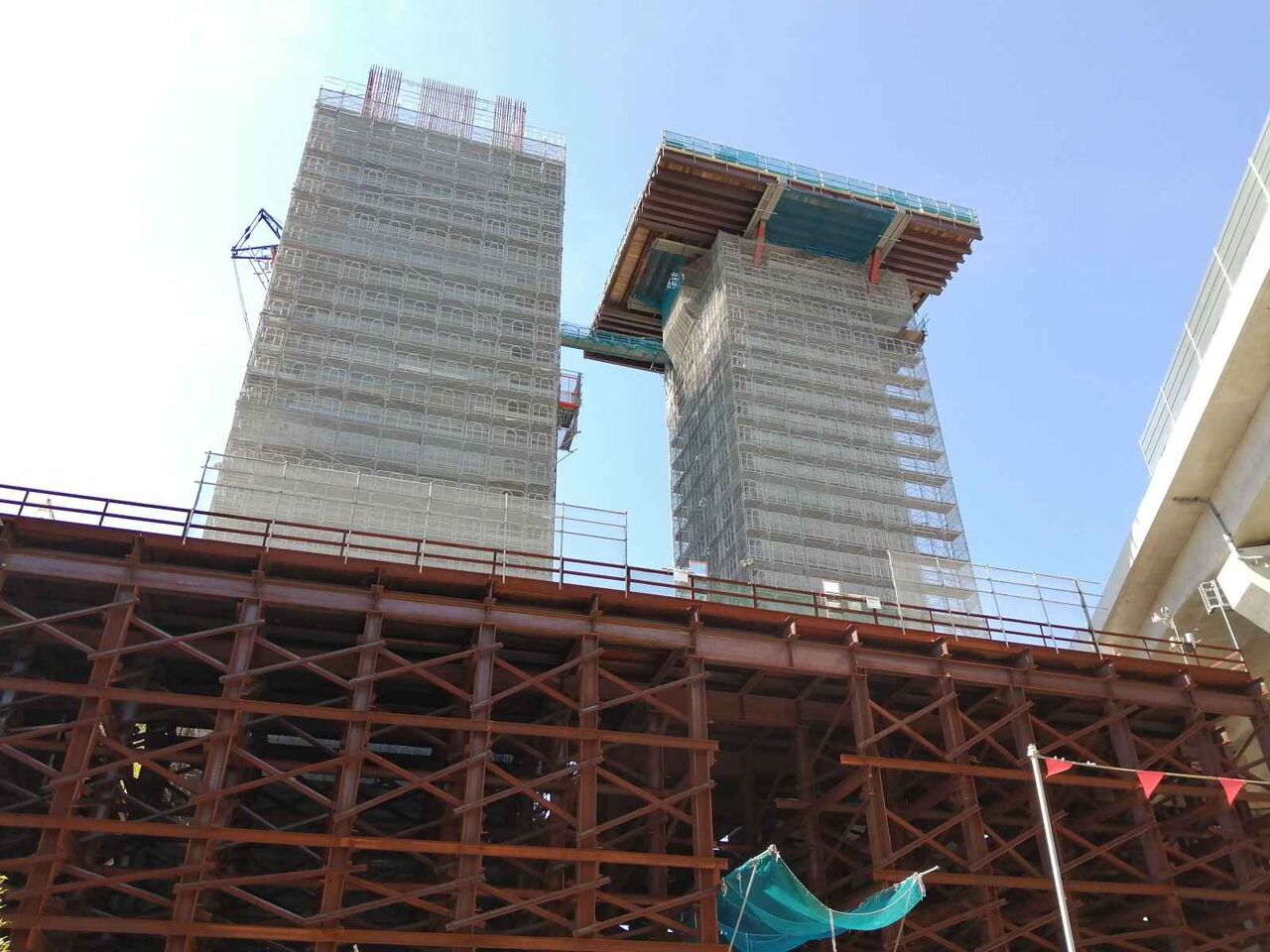 左手の橋脚が上までできてこれから両側に橋梁を伸ばしていく工事になると思われます。