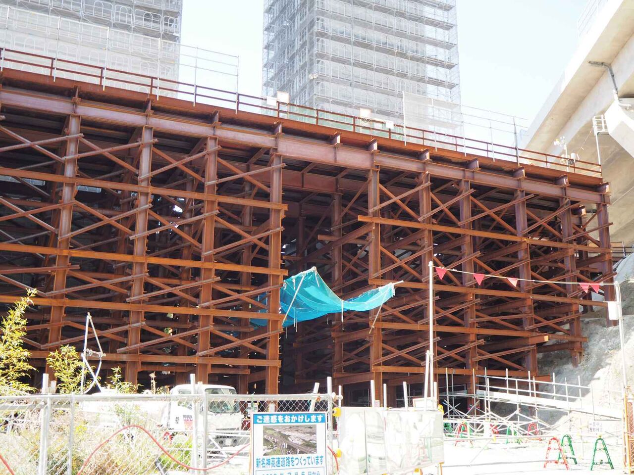 発想が貧困なのですが、清水の舞台とジオタワーに見えます。。中央の開いているところから先は川久保に行く道(新名神の側道)につながり、資材や燃料の補給コースになっているようです。橋脚から橋梁が伸びてきたらまた追記したいと思います。