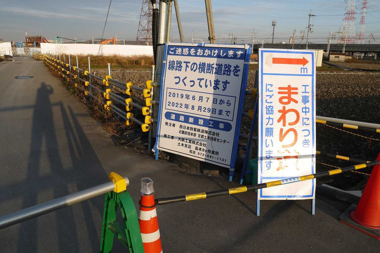 現在JR京都線の南北について線路の側道が上牧に向かって工事がなされていますがこちらは南側。まだ途中で止まっています。(めっちゃ撮影者の影が映ってます。。)