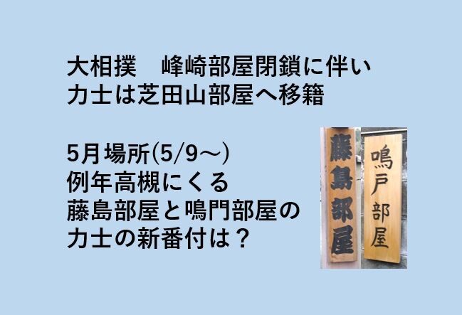 3月いっぱいで、峰崎部屋が峰崎親方(元幕内三杉磯)の定年に伴ない、力士は芝田山部屋に移籍されました。昨日2021年の5月9日から始まる5月場所の力士の新番付が発表されました。例年高槻に来ていた力士の各部屋の力士の番付はどのようになっているのでしょうか?