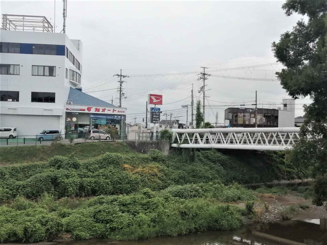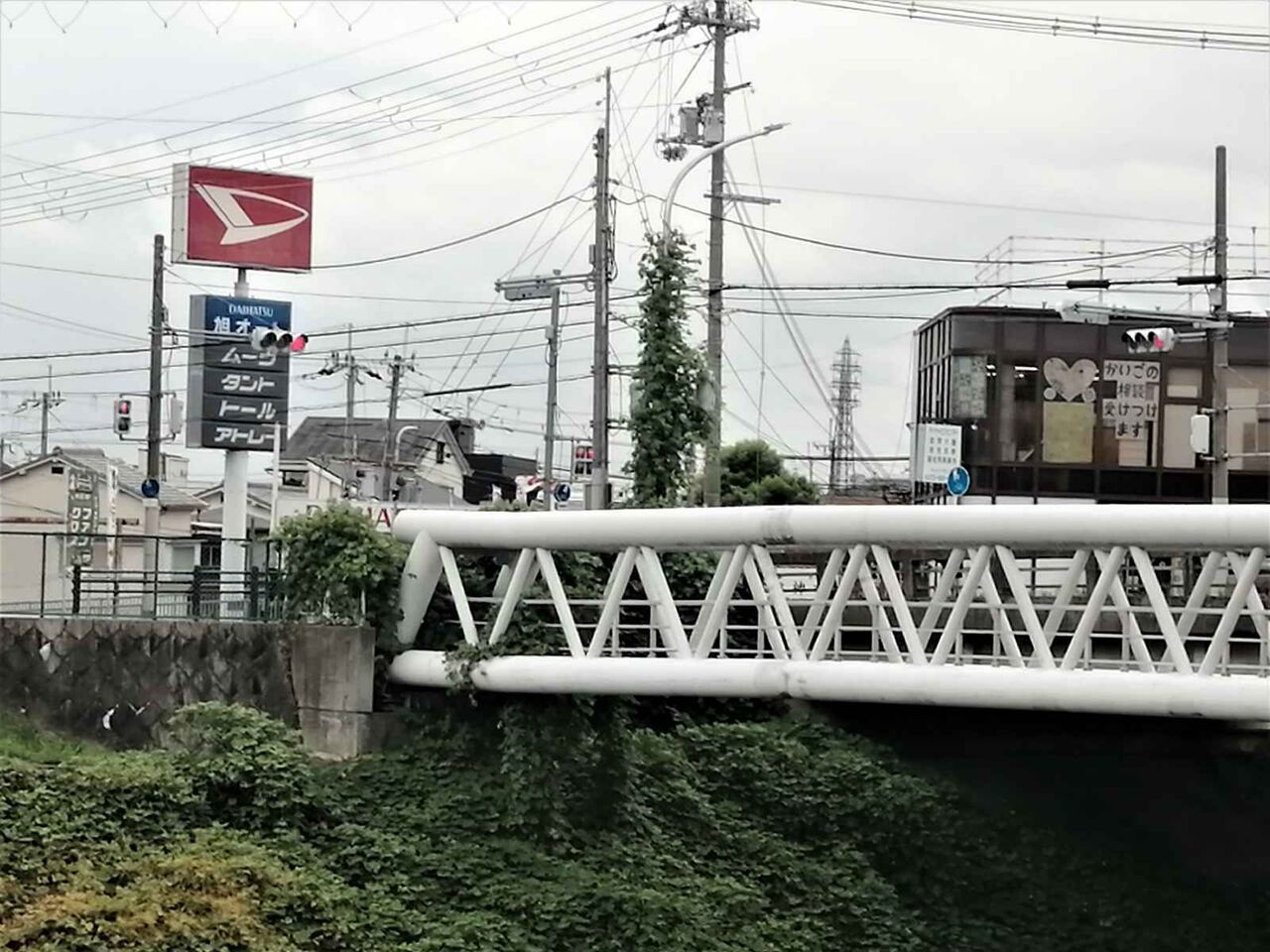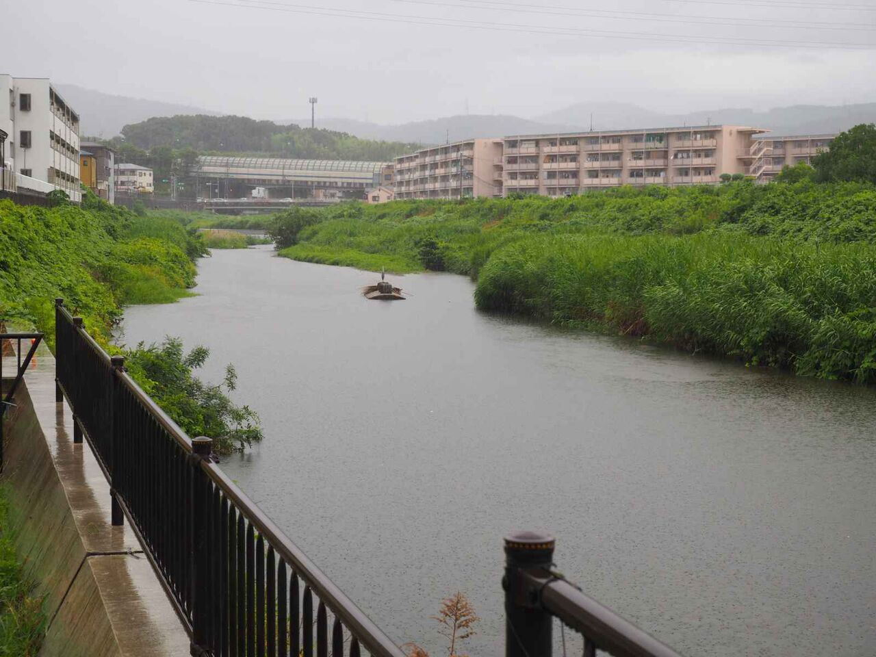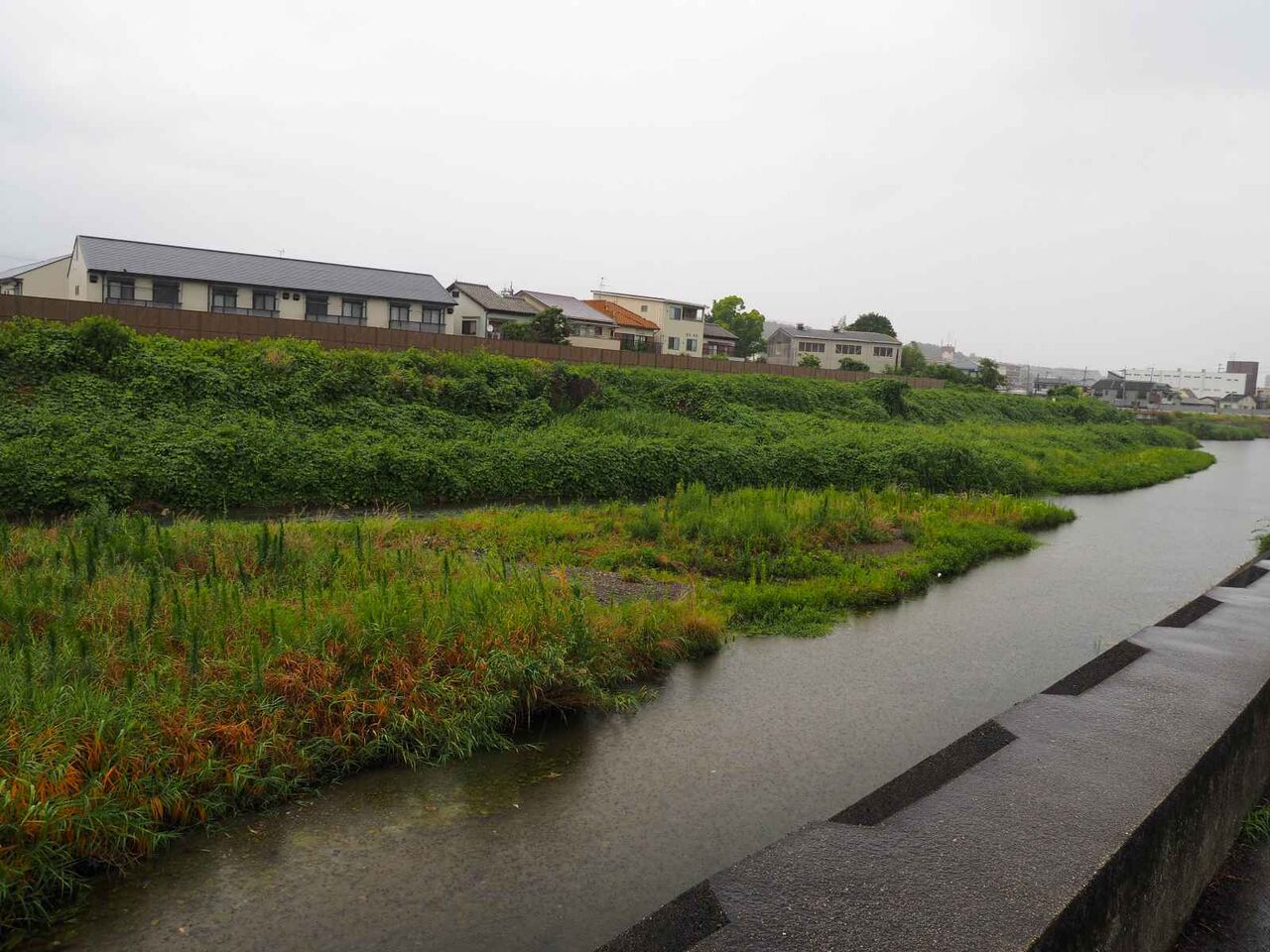 ここの檜尾川の堤防沿いには道があって、安満御所の町から山手町の方にくる道になります。道路沿いにもはみ出す勢いに。