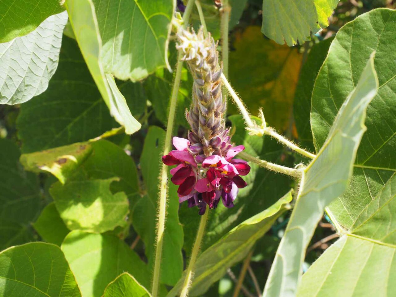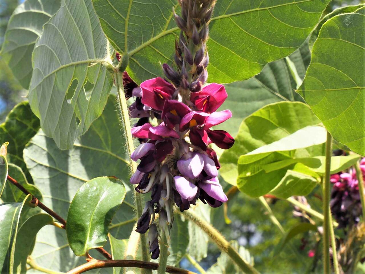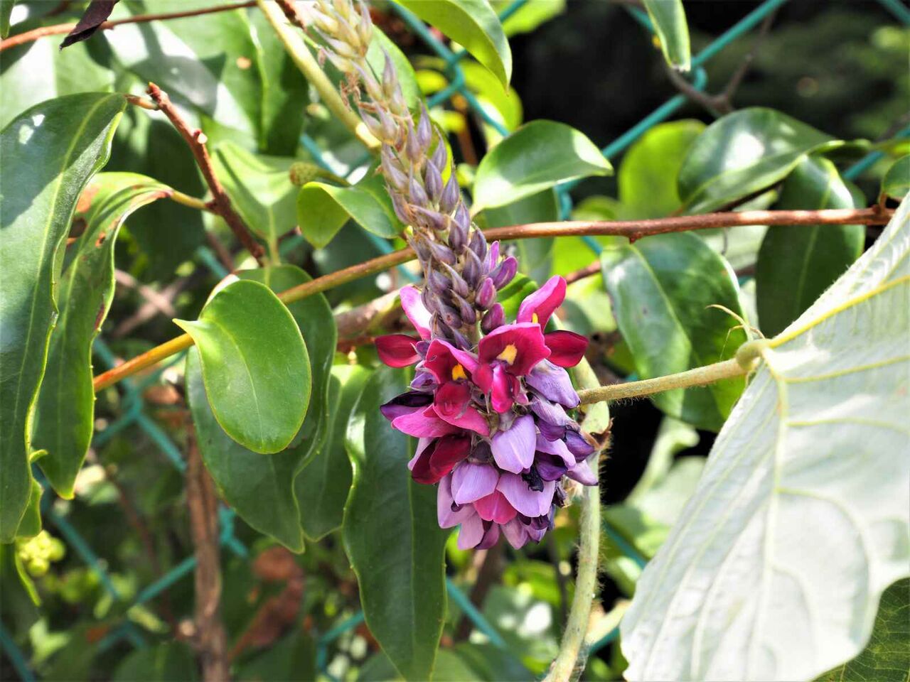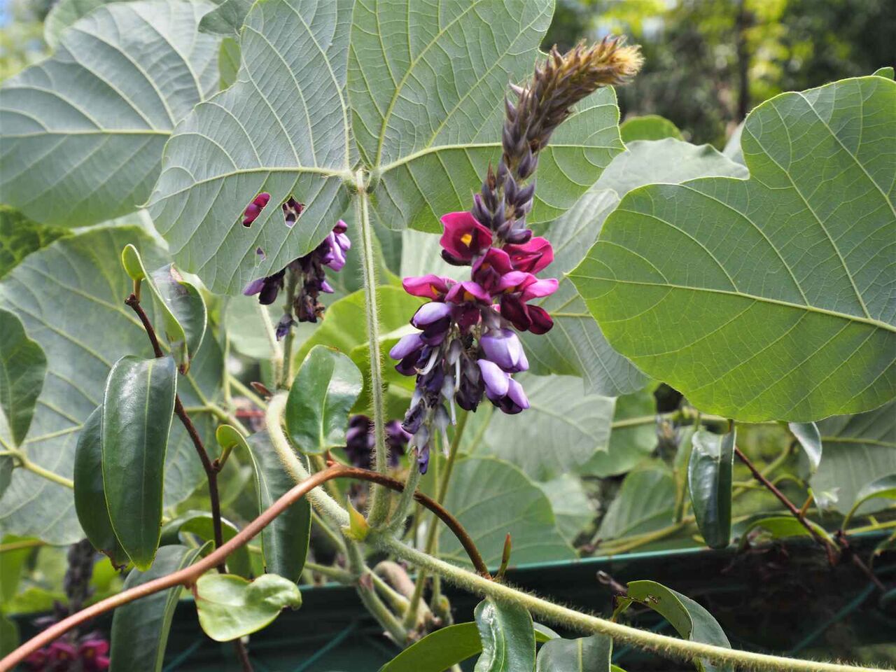 つるといえば、フジの花に似てますね。房の上から咲くこと、花の形が似ています。ほかにもこのように上向きに咲く花もあります。においはどうでしょうか。あまりフジにくらべてにおいは感じません。
