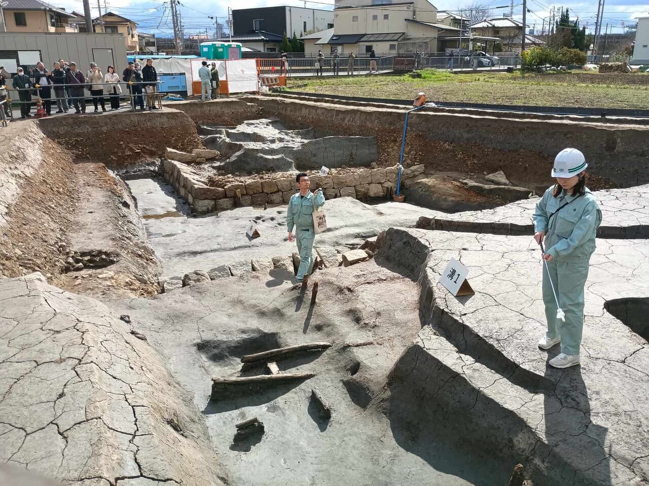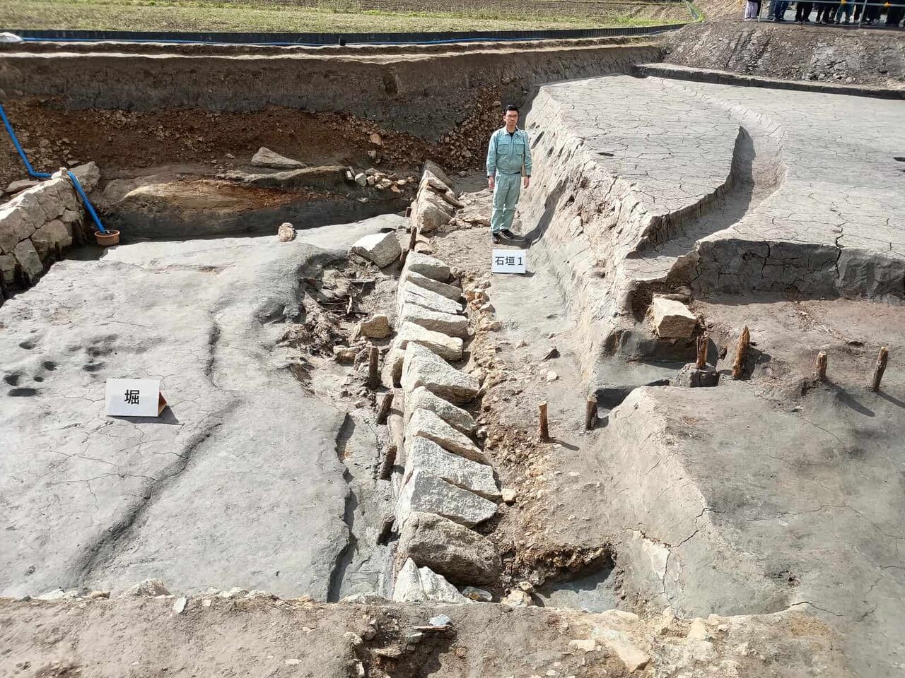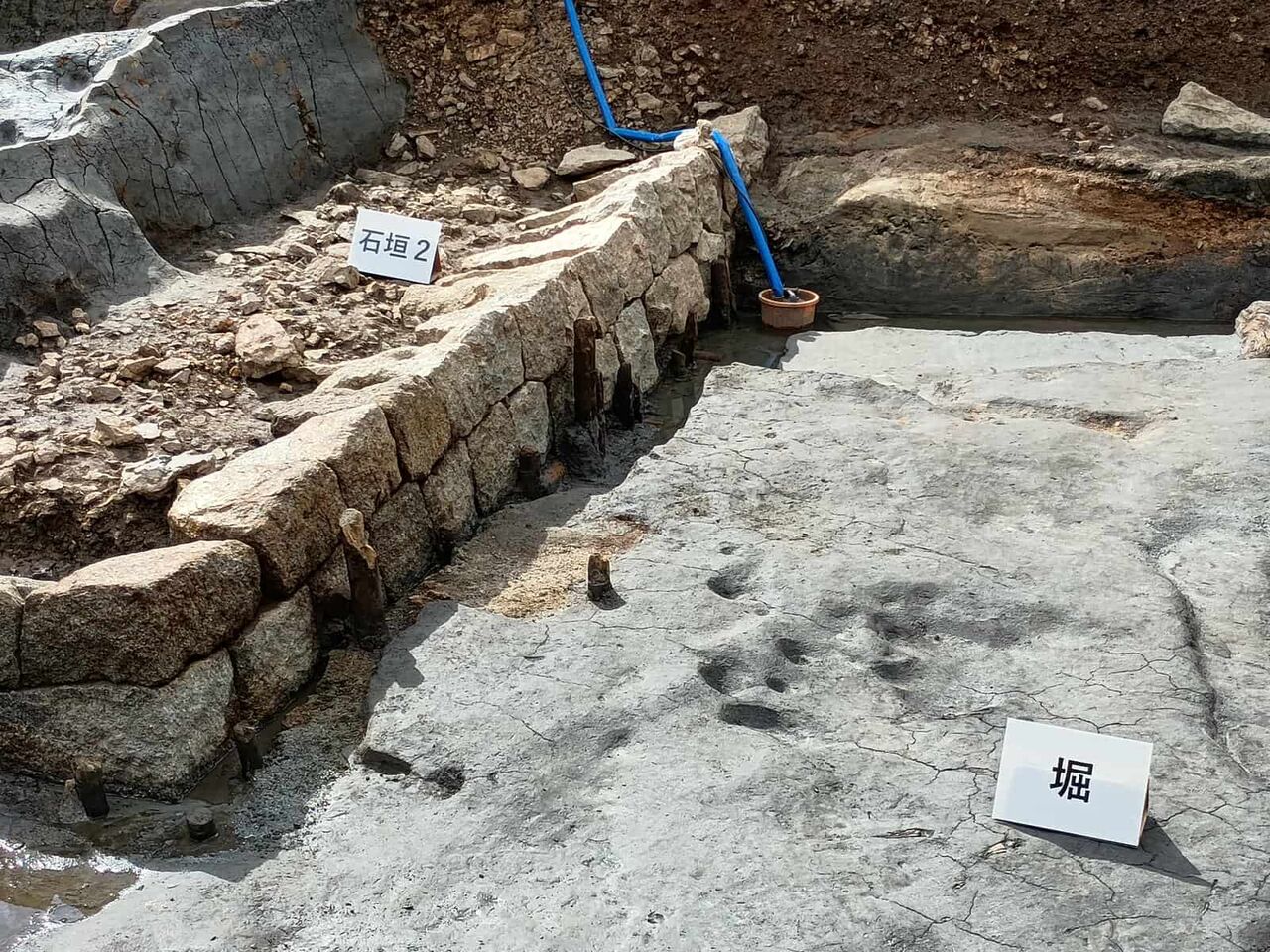 上に見えるL字型の堀あと、さらに手前の水路?のようなくぼみと橋けた?のような木材も発見されたようです。