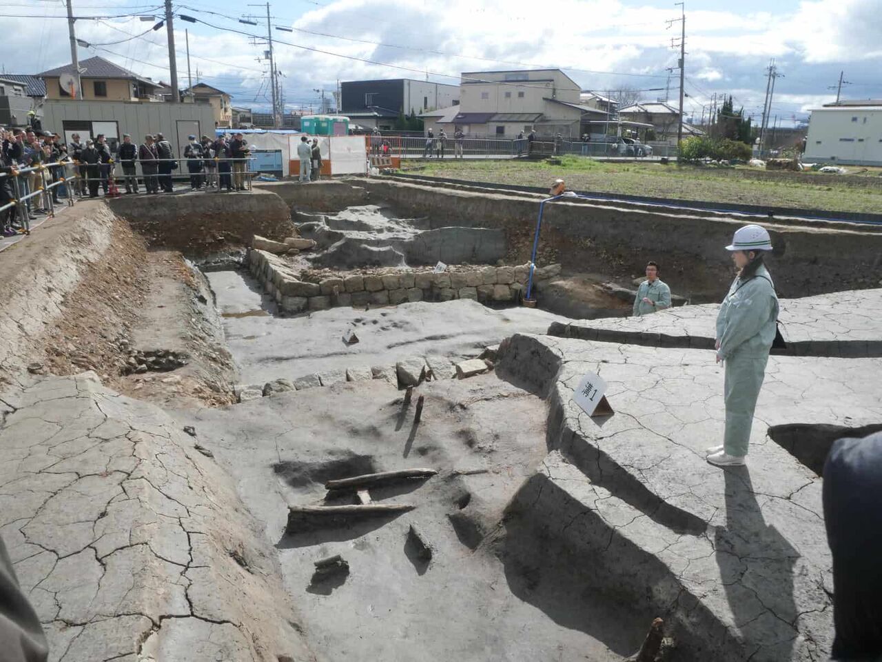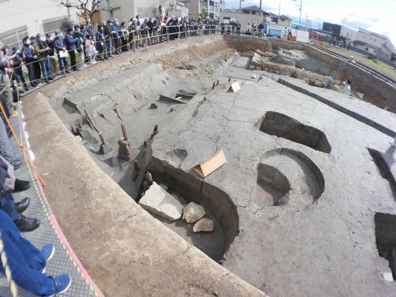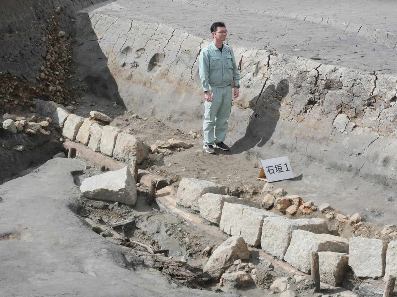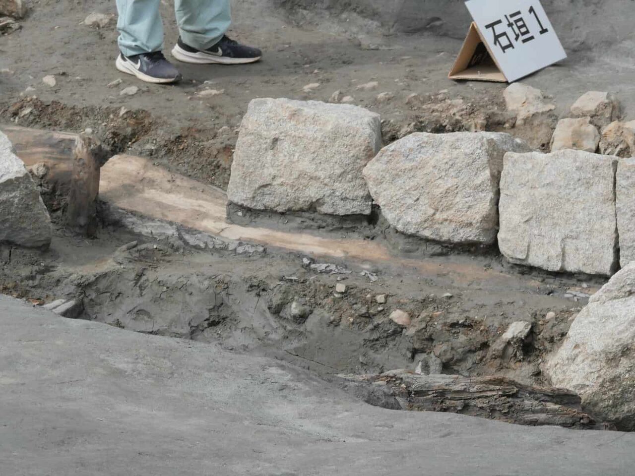 上に見えるL字型の堀あと、さらに手前の水路?のようなくぼみと橋けた?のような木材も発見されたようです。