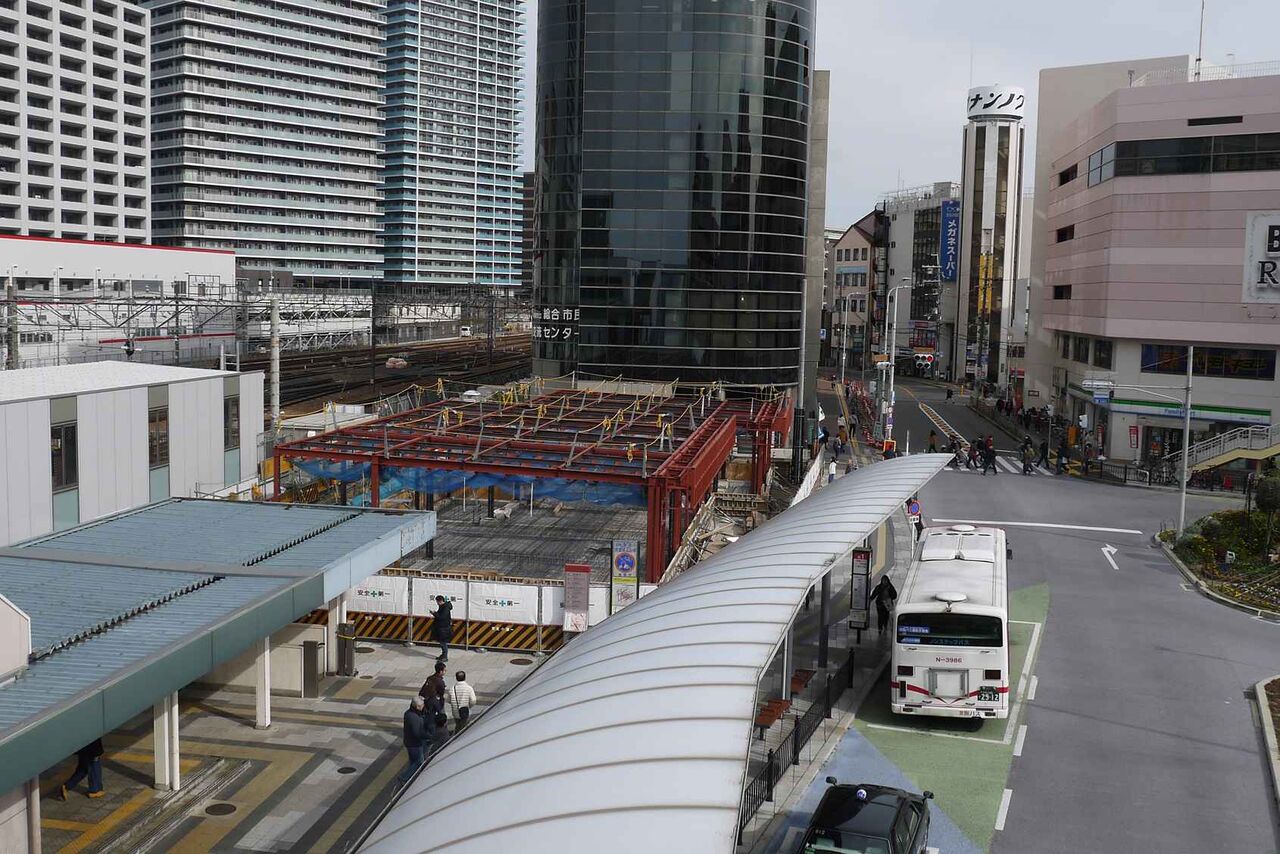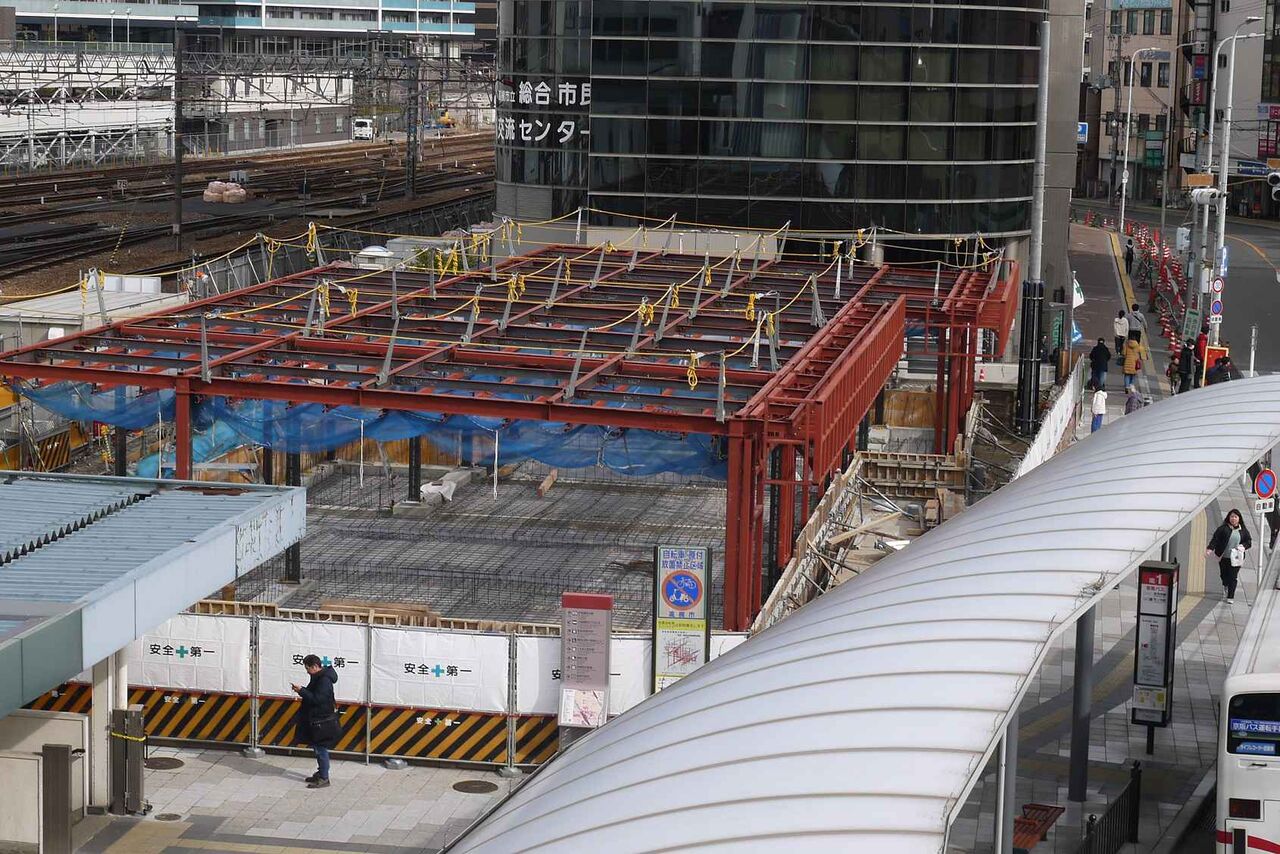 JR高槻駅南側、クロスパル高槻(市民交流センター)との間に、JR西日本のNKビルの新築工事が始まりましたが、その建物の骨格が見えてきました。