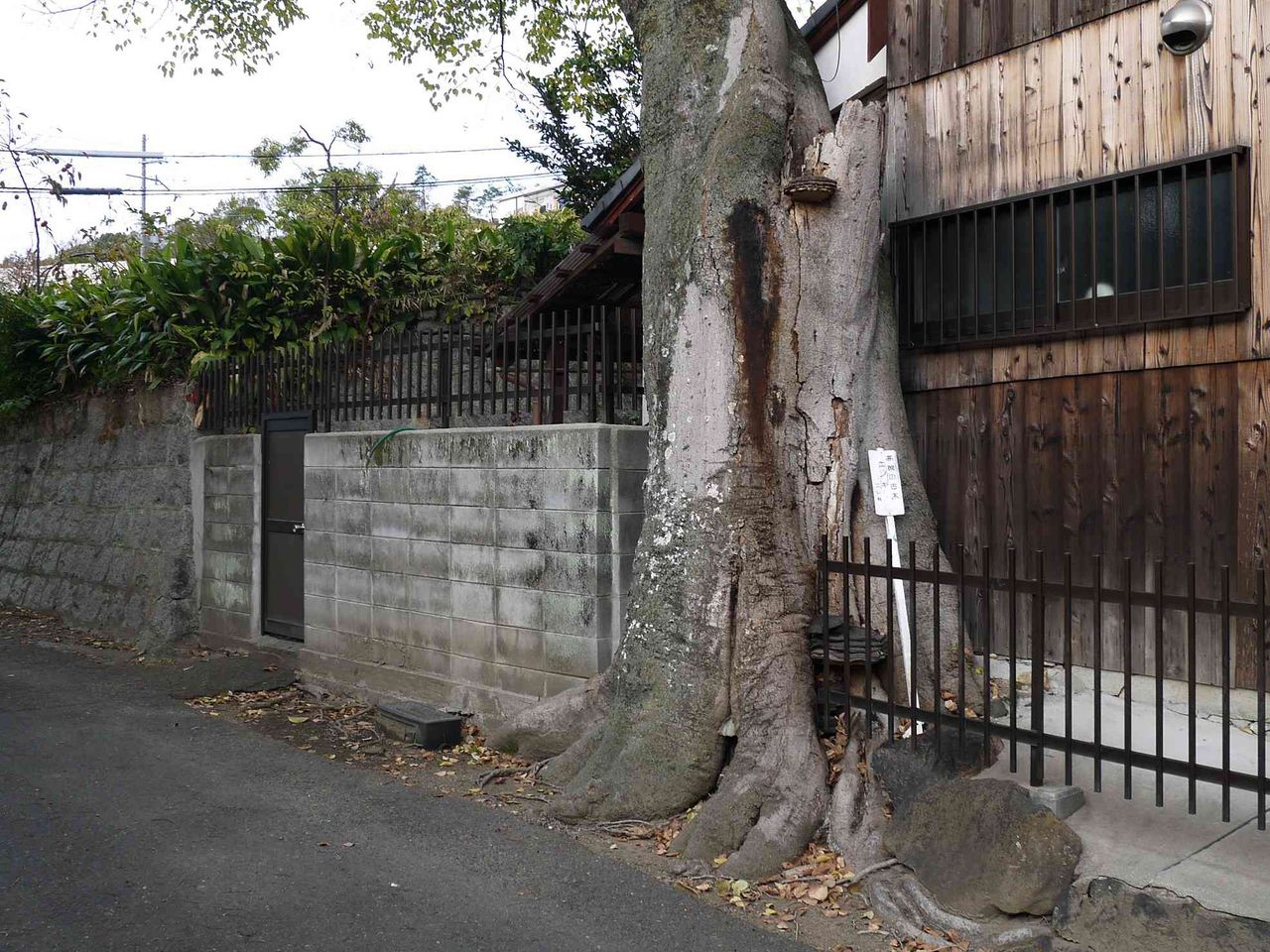 高槻の古木のその2です 桧尾川沿い安満北の町(あまきたのちょう)の御旅所(おたびしょ)のところから入っていくと現れます。民家と道路の境目にある安満北の町のえのきです。