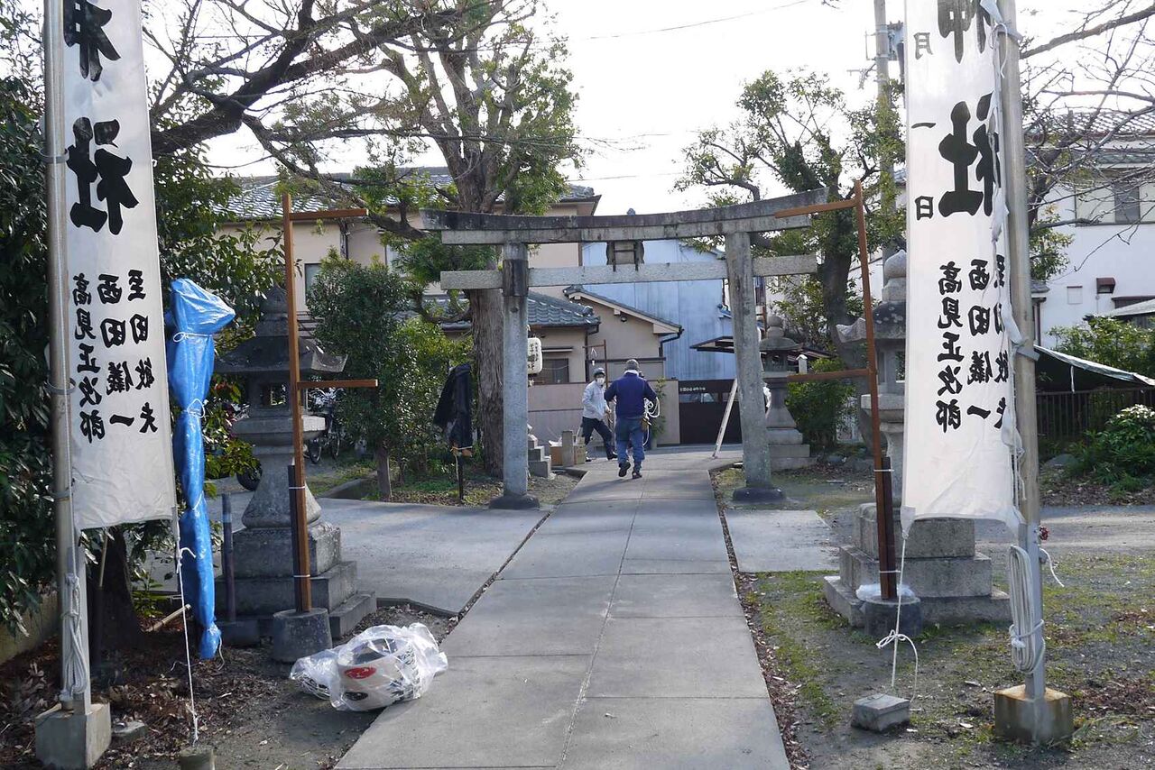 28日でしたが境内の掃除をされるかたとお宮参りの方がおられるだけのようすでした。しかし、その後のえびす祭りののぼりもあります。