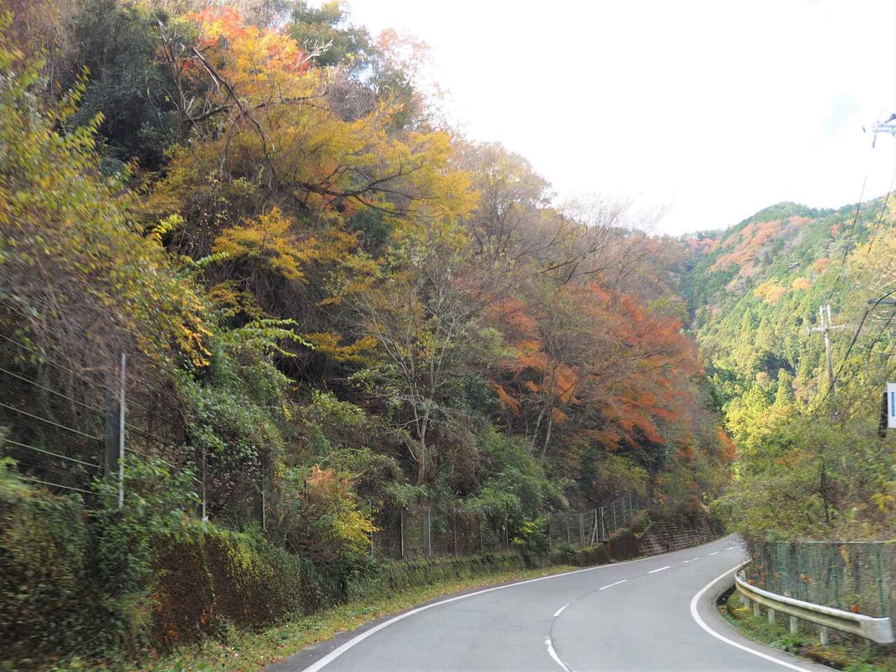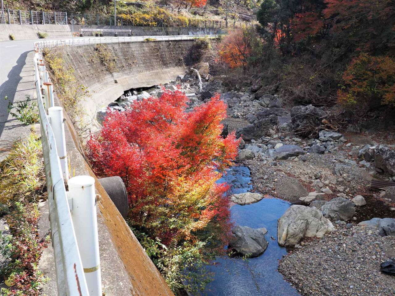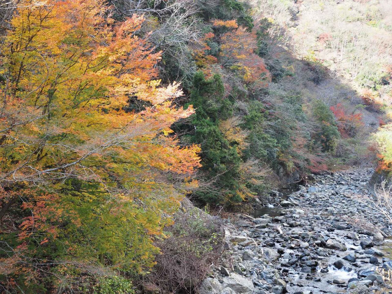 つるが谷と空谷橋の間です。ここは山肌に広葉樹があって紅葉が見えるのですが、ほとんど落葉してしまっているようです。