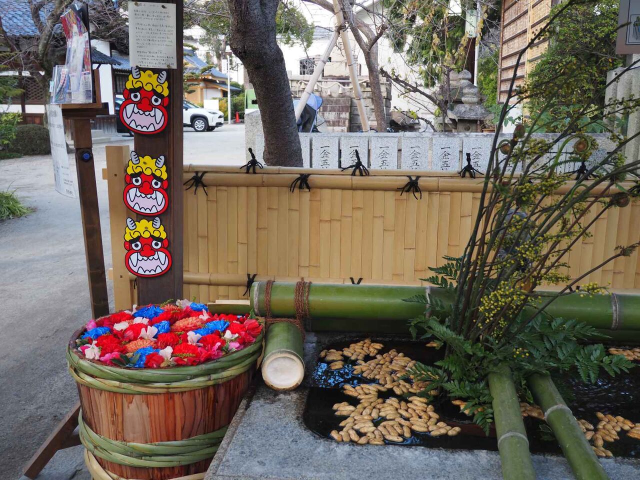 鬼の面も貼られていました。豆のかわりに落花生?右側の生け花は、ゼンマイと黄色のナンテンでしょうか?