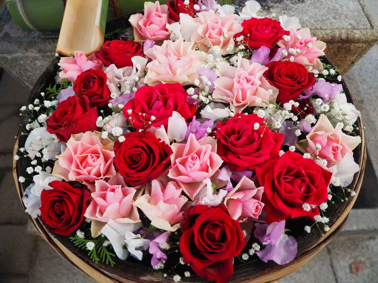 赤とピンクのバラと、白と薄ピンクはスイートピー、小さい白いのはかすみ草のようです。