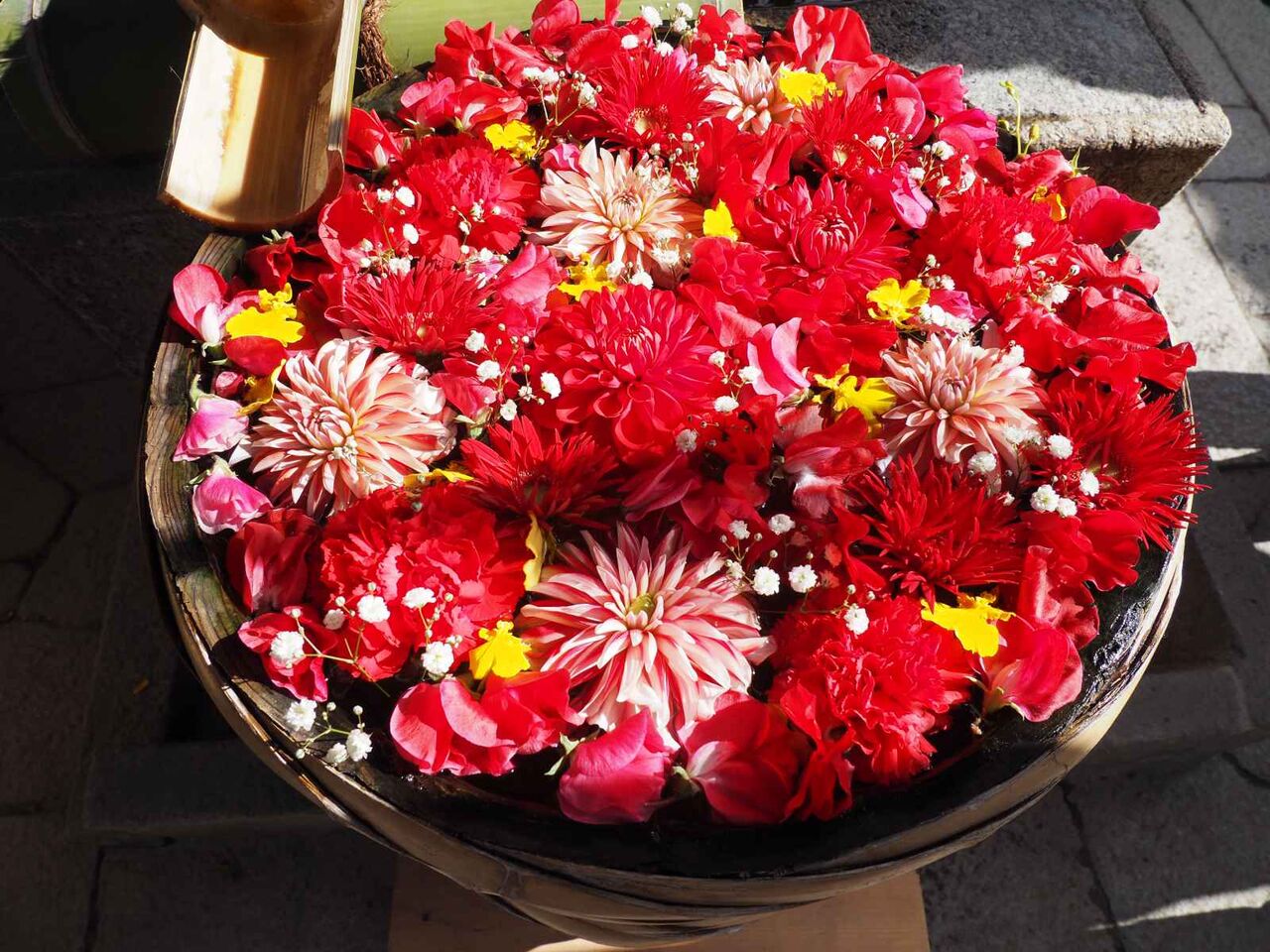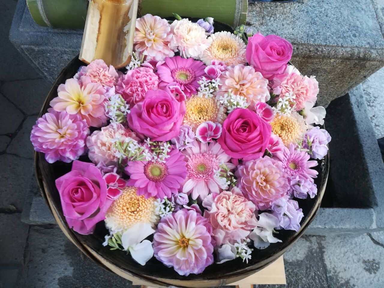 一方、奥の花手水ですが、黄色がキク、濃いピンクと薄いのはバラ。端にあるのはカーネーションのようです。左下はユリのようですね。こちらもピンクでそろっていますね。