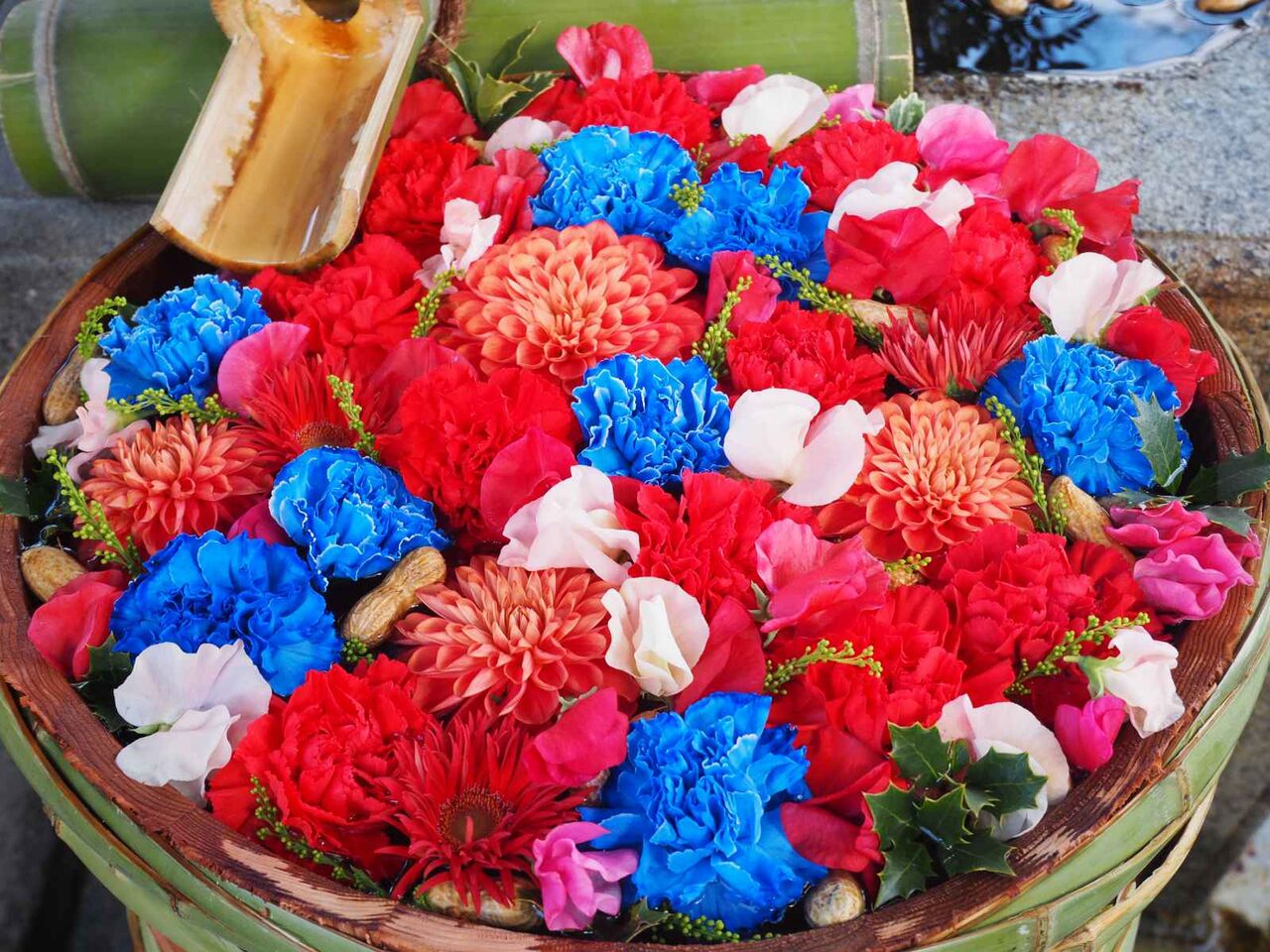 桶にある花もとてもきれい。カーネーション、マーガレット、バラなどでしょうか?