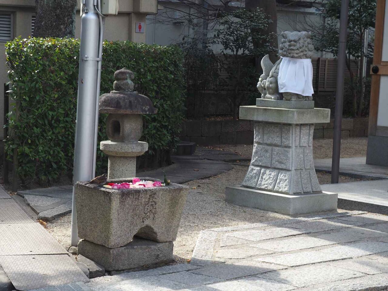 なお、奥の花手水ですが、花手水と、水を飲んでいる鳥と、それを見ているこまいぬ。