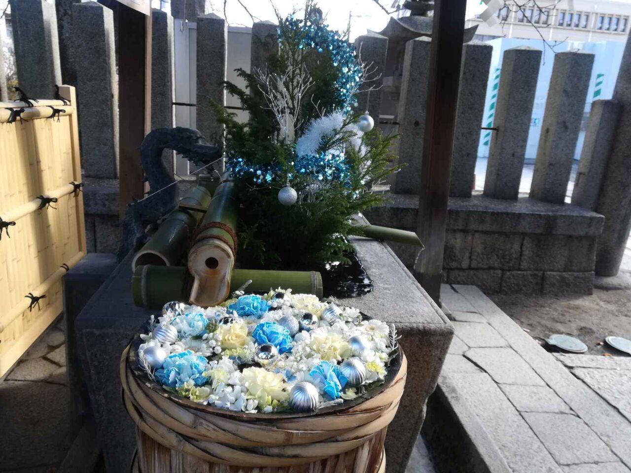 野見神社の花手水 クリスマスの花手水とは?どのようものなのでしょうか?洋と和が対比して面白いです。