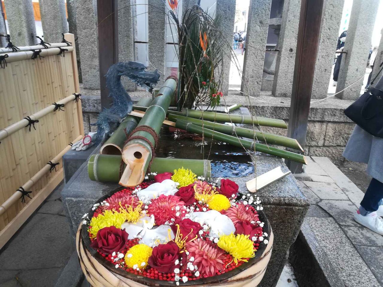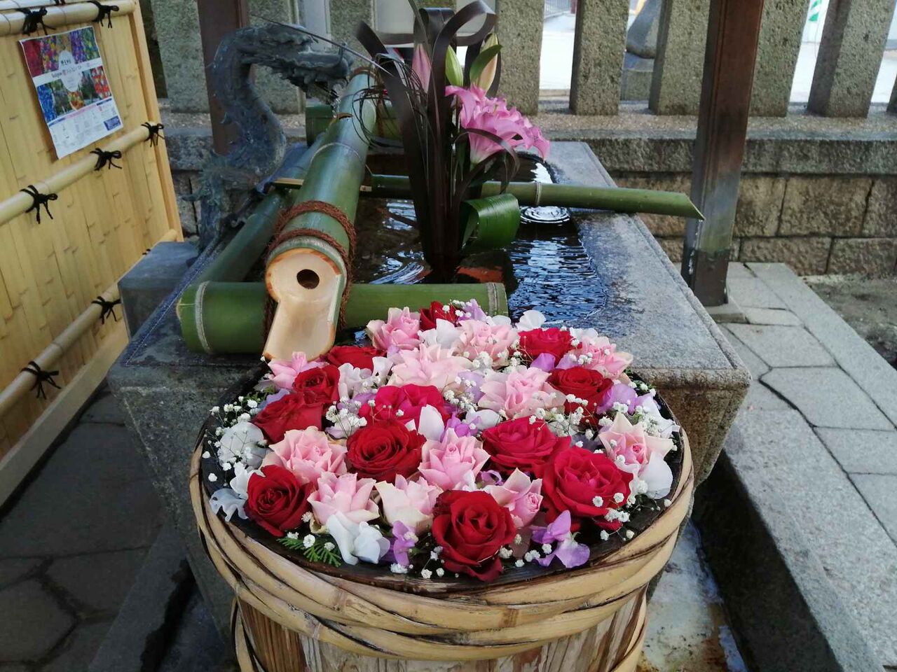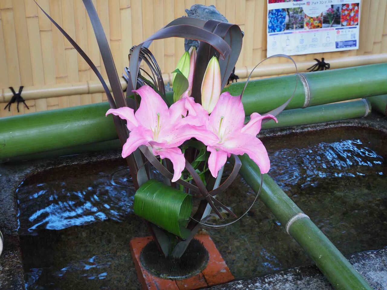 いっぽう、生け花は、ユリのカサブランカのようですね。水が流れる竹の部分も新しくなっていました。さらに奥にも花手水がありました。