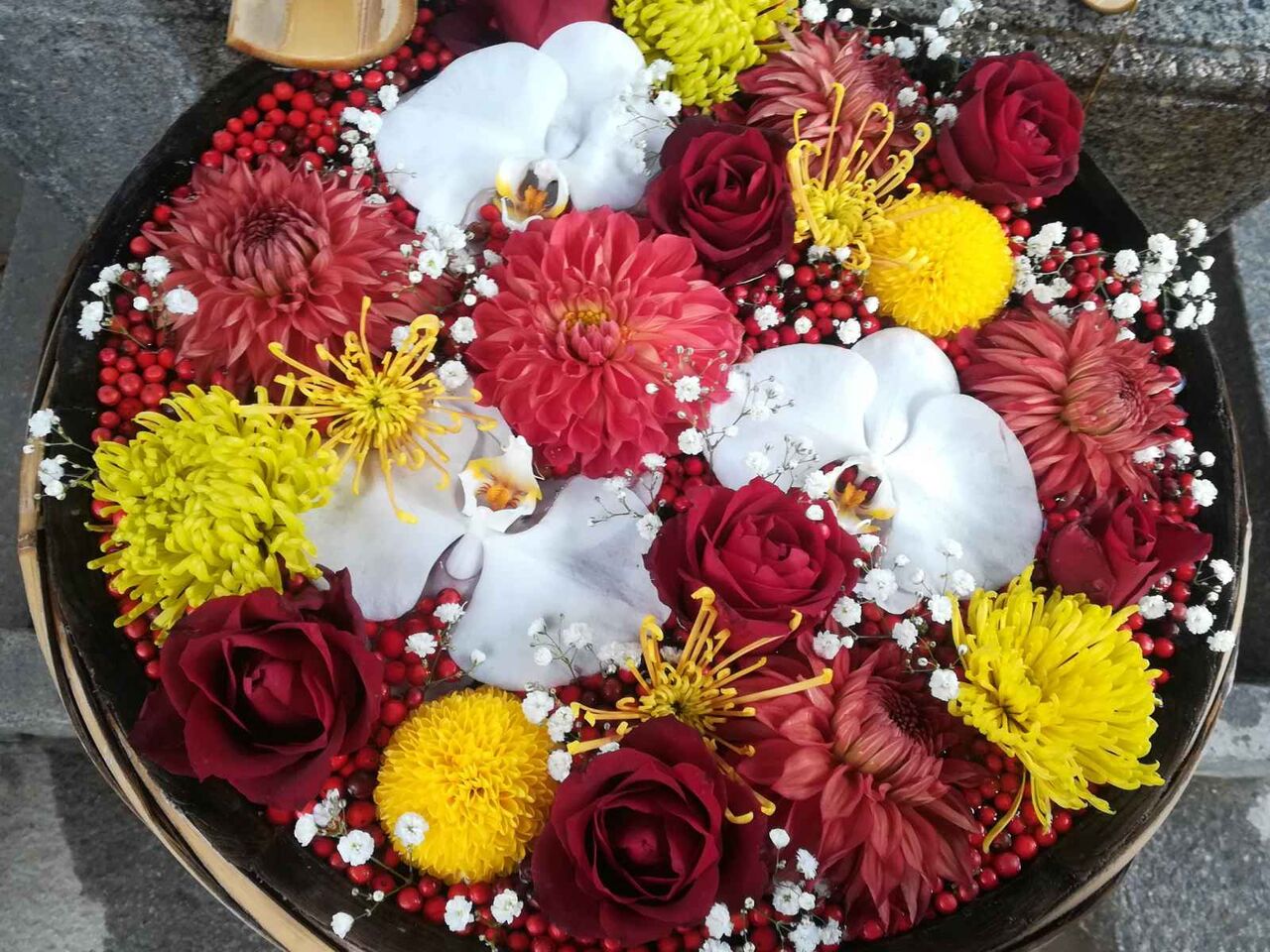 白がラン、キクとバラ、白いちいさなのがカスミソウです。あと周辺にナンテンがありますね。