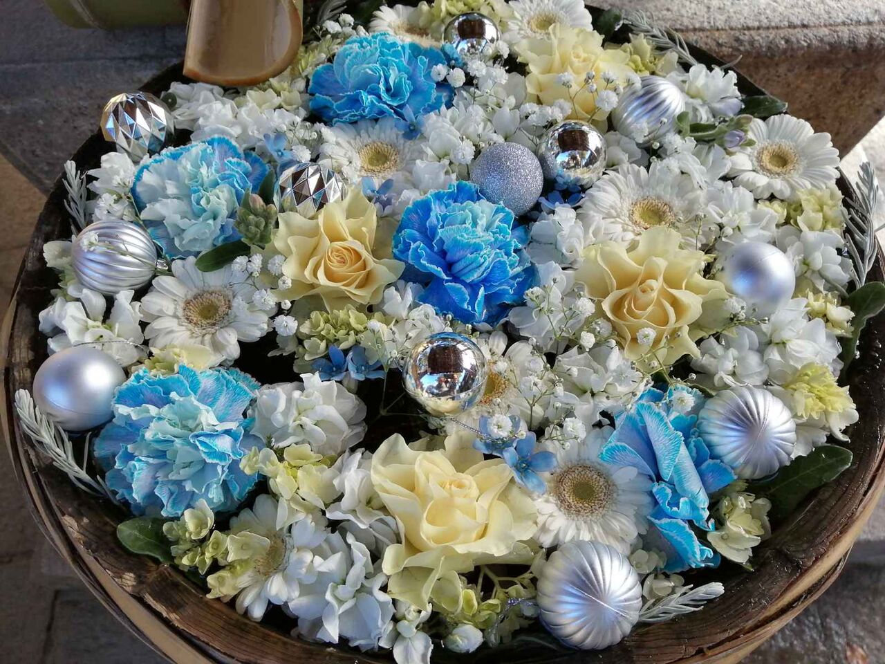 白と青の明るいクリスマスカラーですね。花をよく見ると、青がカーネーション、うす黄色がバラ、白がガーベラ、小さい白がカスミソウ、クリーム色がアジサイと思われます。いろいろなオーナメントボールもいっぱいあります。鏡のようなボールもありますね。写真撮ってる姿が写りこんでます。。