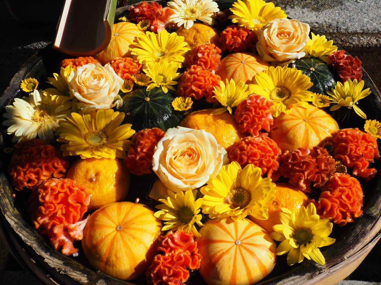 濃いオレンジはケイトウ、丸いのは飾りかぼちゃ(黄色と緑も)、同じく黄色いゆずもありますね。中央はバラです。そのほかキクもありますね。同じ系統の色合いがすごいです。