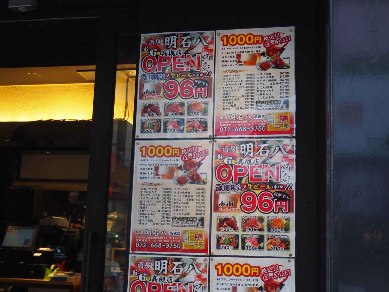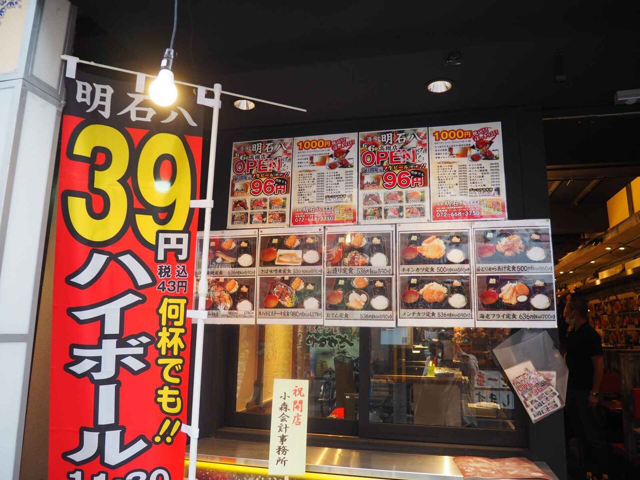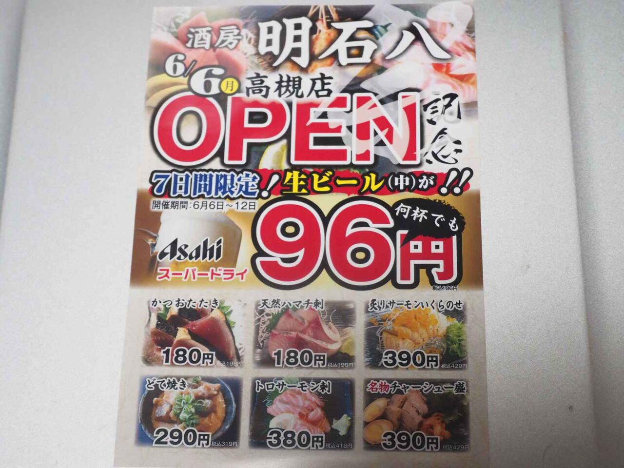 2022年06月06日 高槻本通り 酒房 明石八高槻店が今日11時半に開店するみたい 高槻本通り 酒房 明石八高槻店が今日11時半に開店されるようです。以前に中華料理かまへんがあったところ。江坂のほか大阪に4店舗あるお店のようです。お店の前にはメニューがありました。ハイボール39円?11時30分~17時とあります。海鮮を中心としたメニューのようですね。今日から12日までには生中のサービスの割引もあるようです。税込み1000円のセットのほか、海鮮中心のメニューがたくさんあるようですね。営業時間:11時半~23時◆以下は昨年8月末に開店された、以前のお店かまへんのようす。高槻本通りですが、中華料理のお店、かまへんが開店していました。以前肉寿司のあったところ。 「ニュース」カテゴリの最新記事 タグ :#酒房#明石八高槻店#中華料理#かまへん#肉寿司#開店 < 前の記事次の記事 > コメント コメントフォーム 名前 コメント 評価する リセット リセット 顔 星 投稿する 情報を記憶