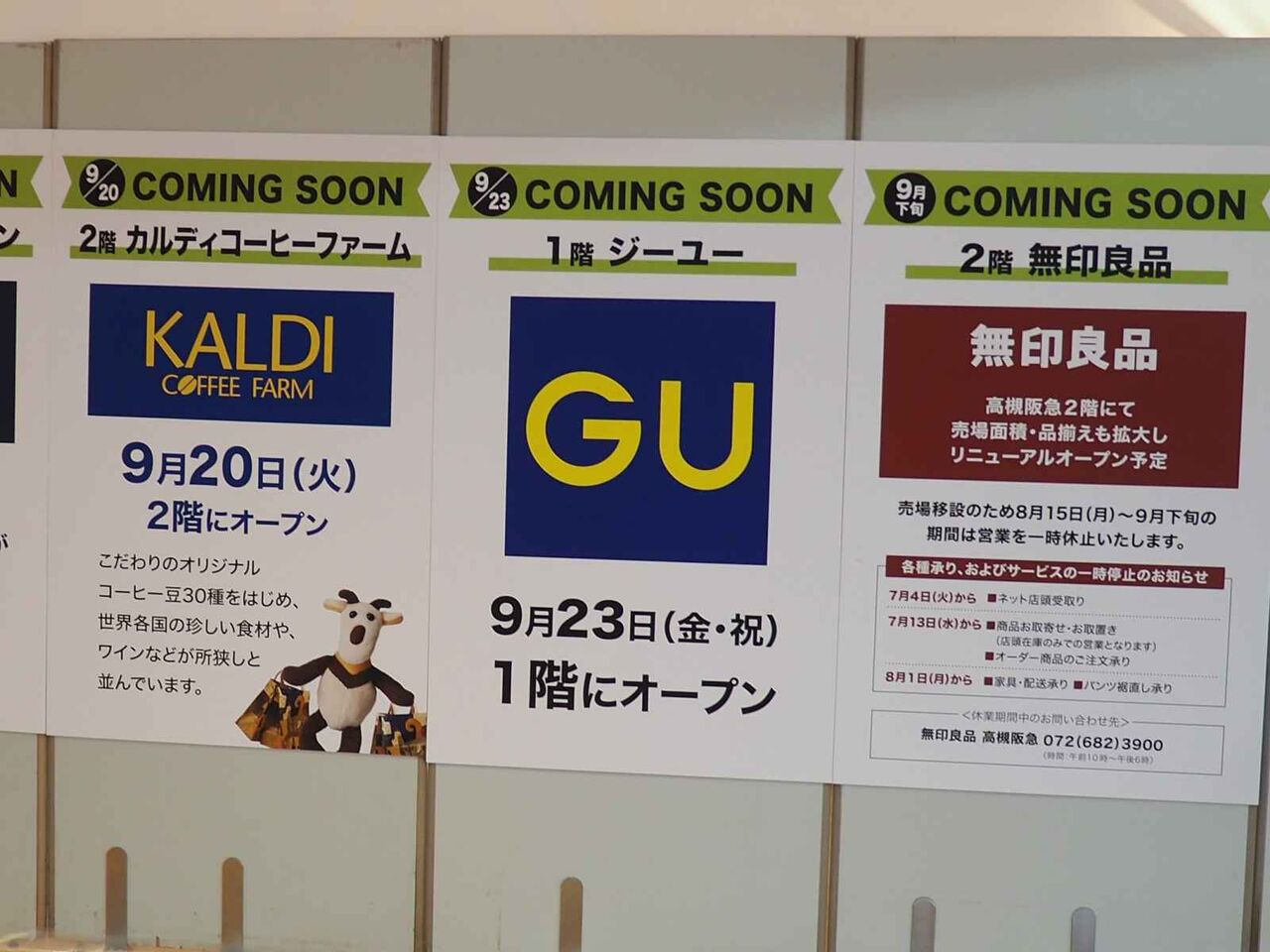 さらに9月23日にはGUが1階に、9月20日にはKALDI(カルディコーヒーファーム)が2階に開店予定のようです。また、無印良品は9月下旬に2階に移転予定のようですね。地下の改装から始まり、ここのところ大幅な改装が続く高槻阪急ですが、8月から9月で大幅にようすが変わりそうです。