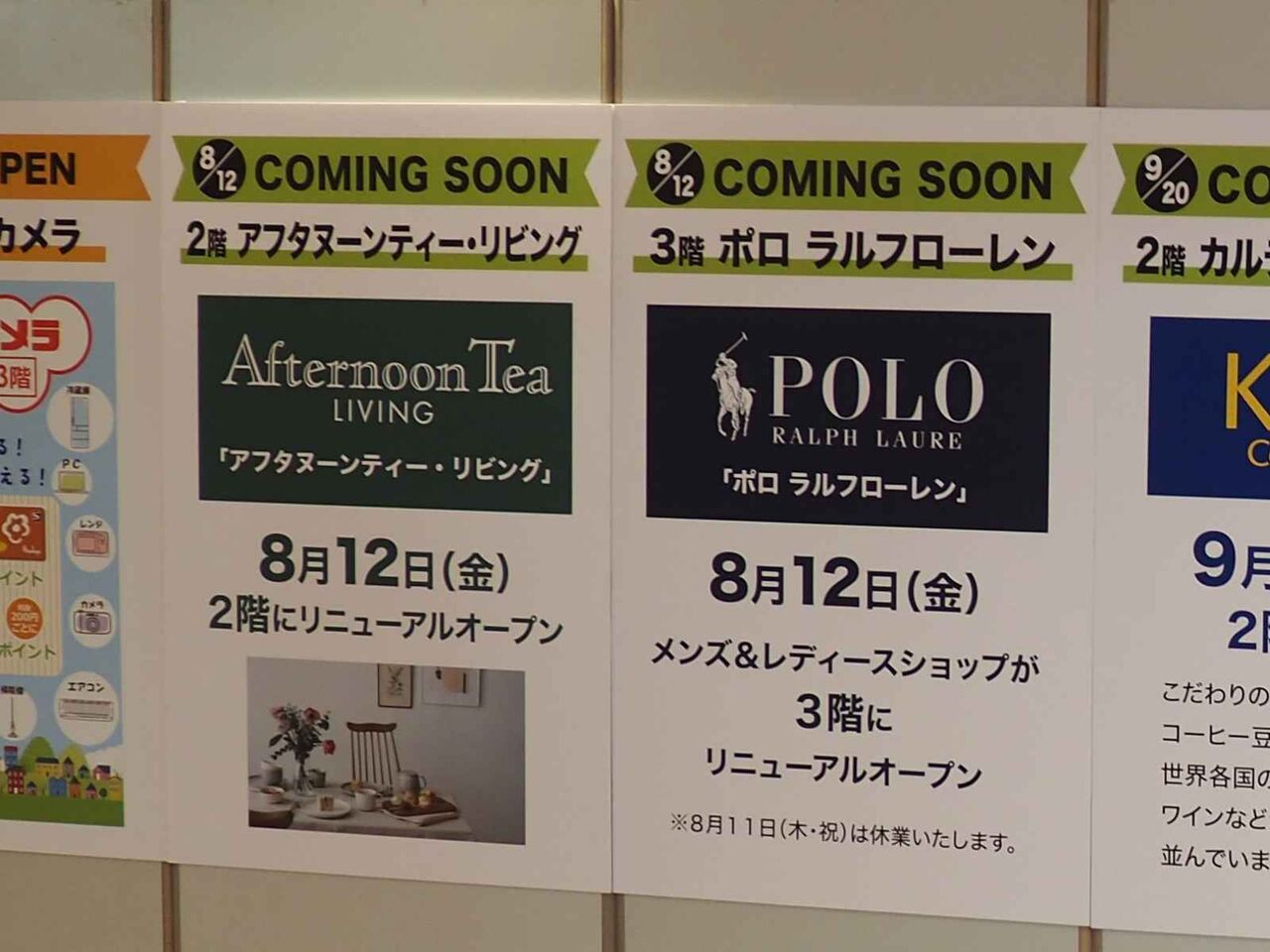 また、アフタヌーンティーリビングが2階に、メンズ&レディースショップポロラルフローレンが3階にリニューアルオープンされるようです。