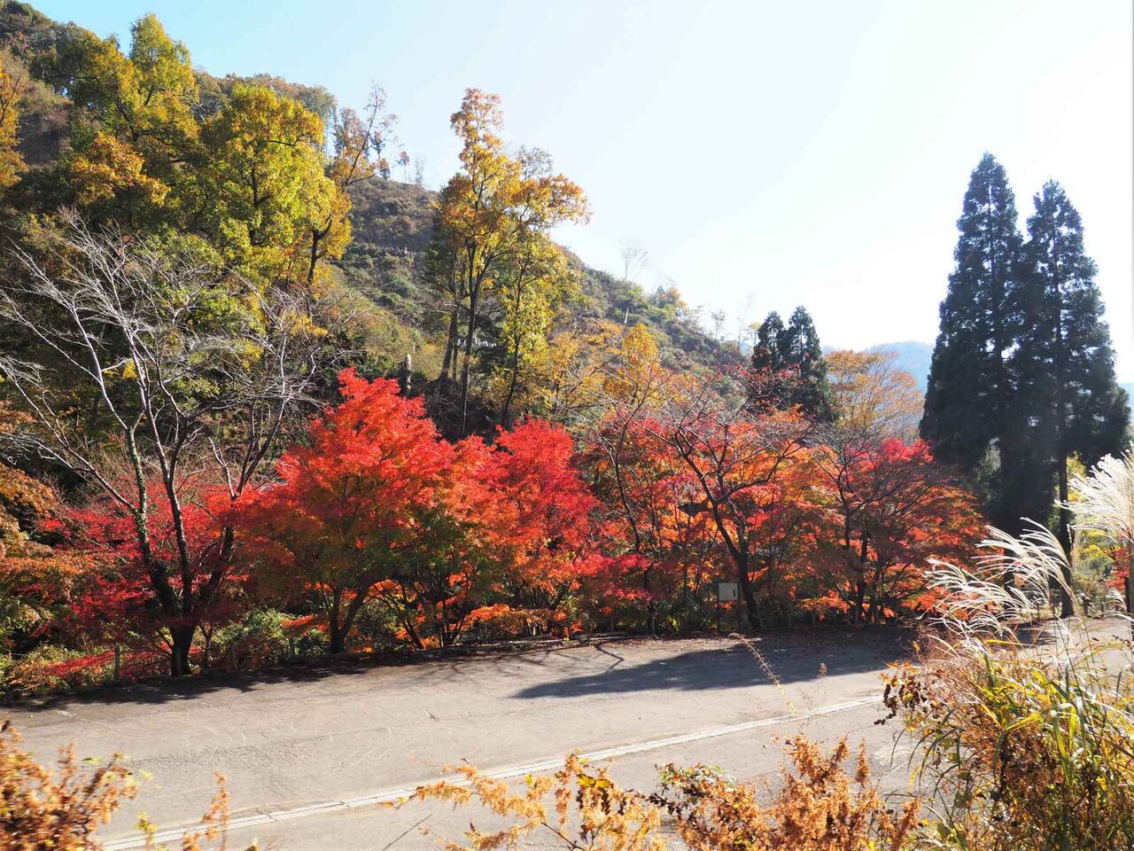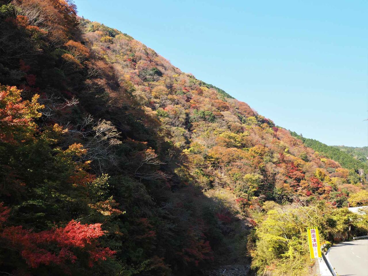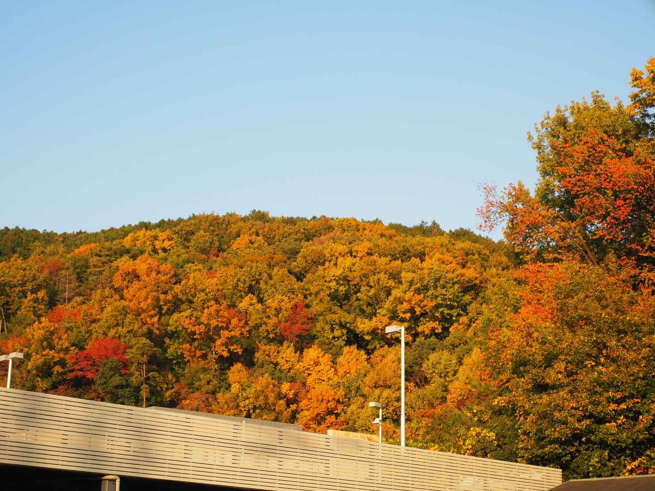 山の山頂方向が広葉樹が広がるのでかなり紅葉してます。