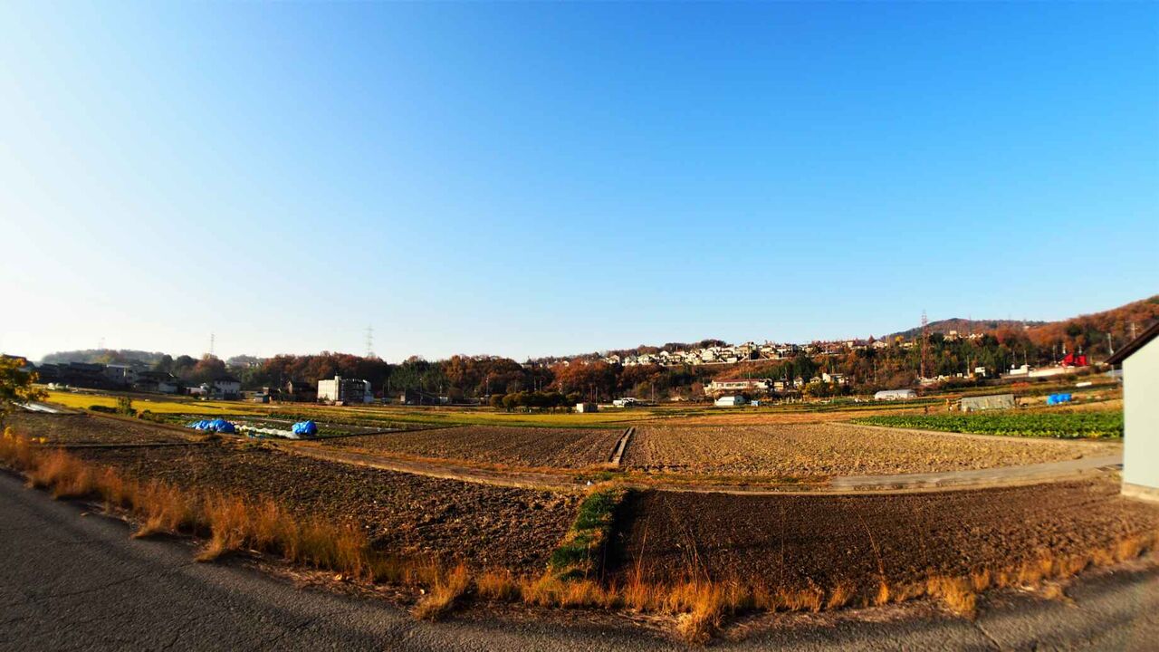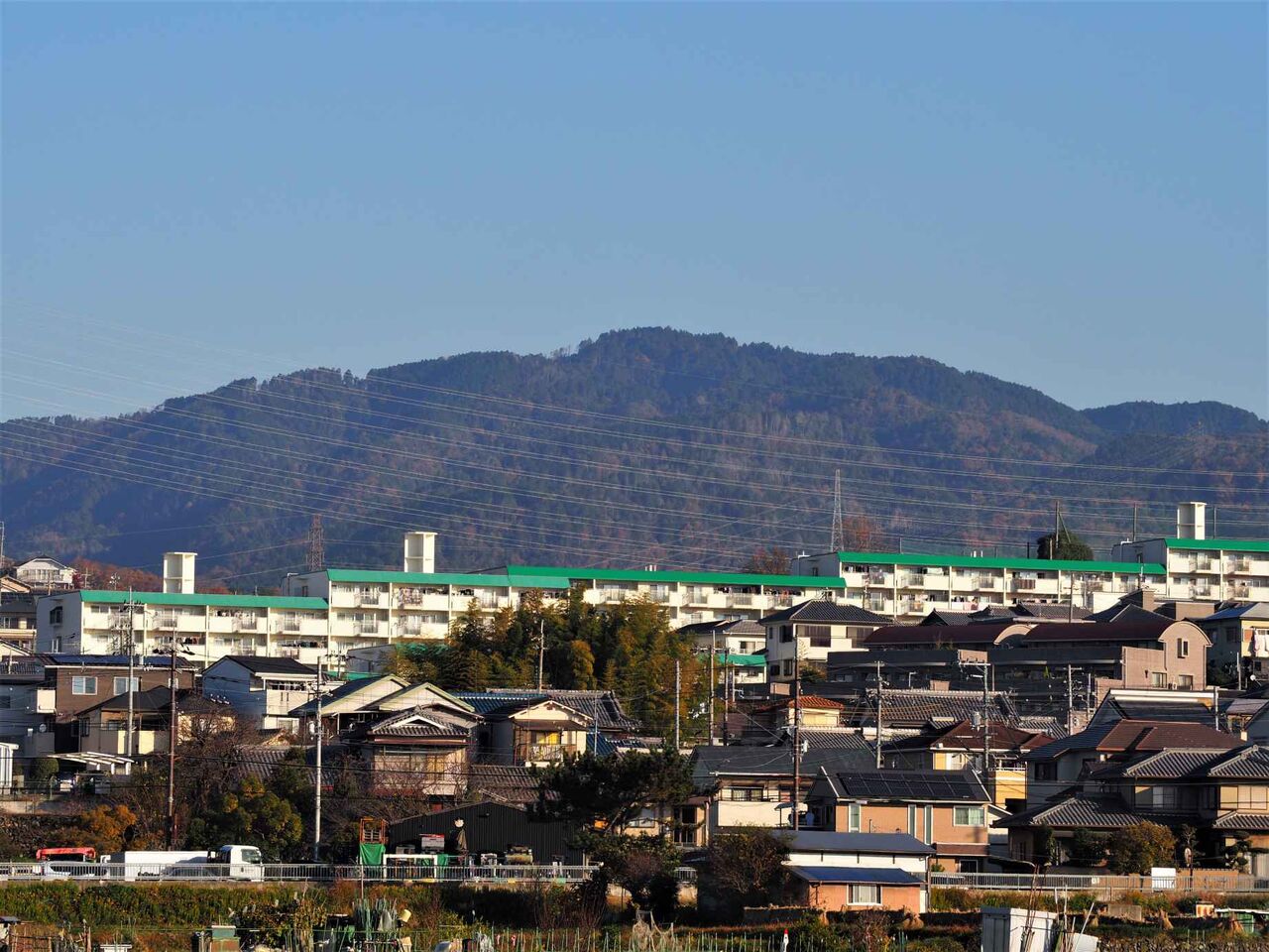 さらに西側を見渡すと、右手中央奥に阿武山、中央には南平台が見えます。左手はあくあぴあ芥川の付近です。