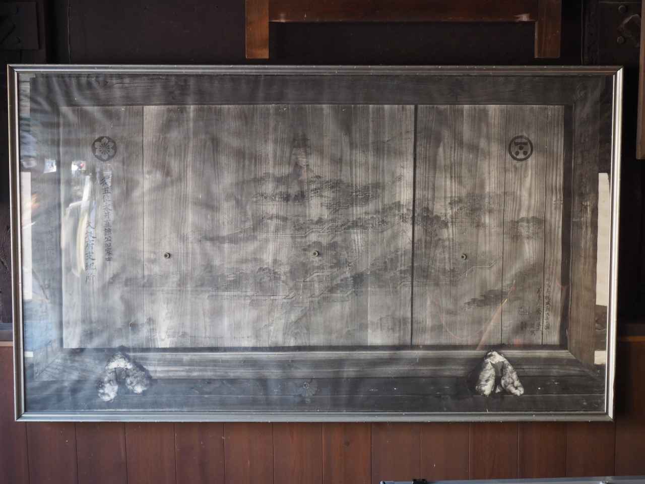 なお、境内の左手には、昔の写真や奉納された絵馬などが飾られています。その中で、現在は写真での展示になっていますが、高槻城の図があります。このほか永井神社にもあるんですが、こちらの図で興味があるのは、中央右、二の丸御殿が建物が複数ある(4つくらい?)ことです。これは今まで御殿の建物の絵図があるんですが、それを裏づけるもののようですね。