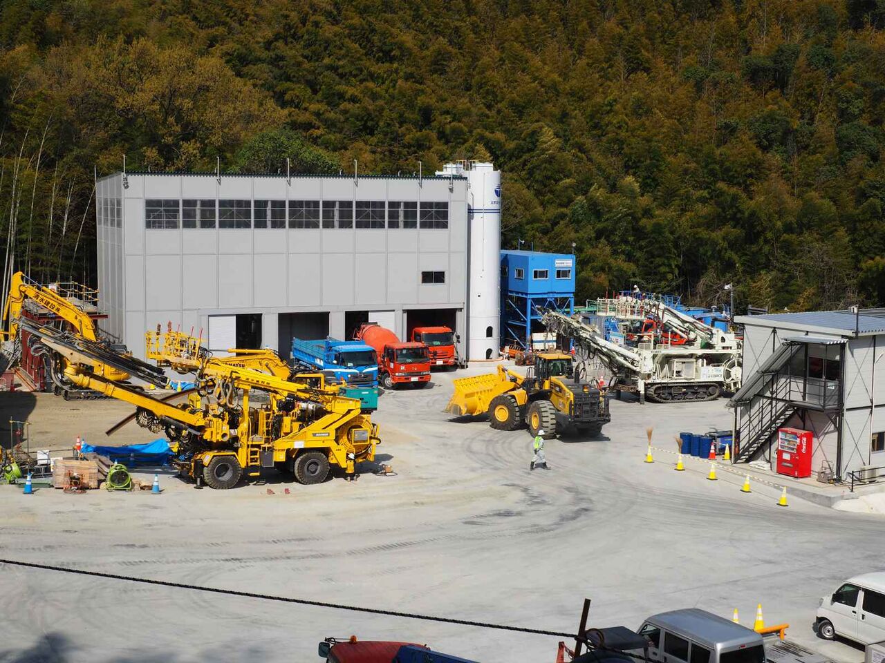 コンクリートを運ぶ車、土砂を運び出す車、それぞれの役目がありそうです。黄色い大きいのは、コンクリートを噴射する?ような車両でしょうか。