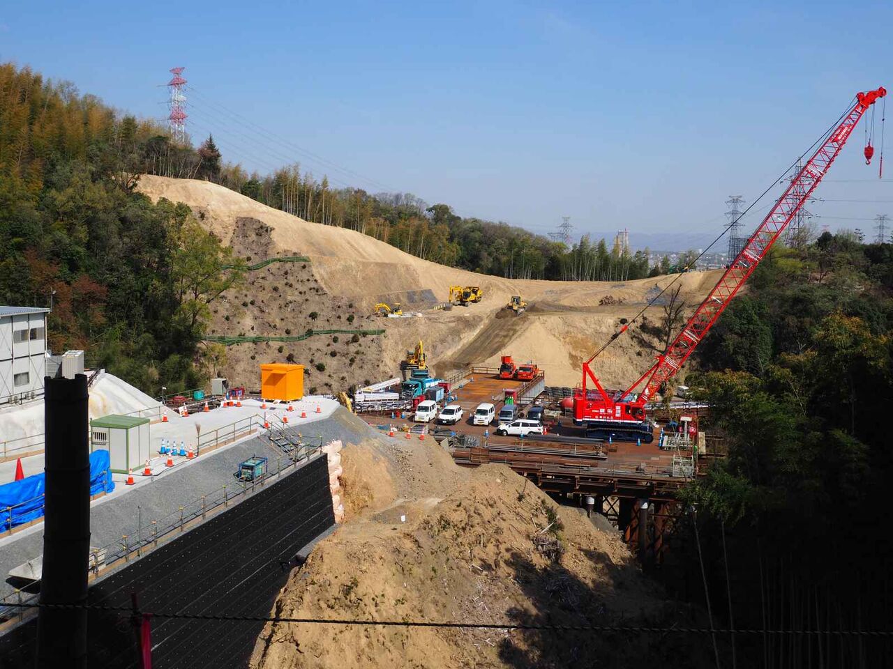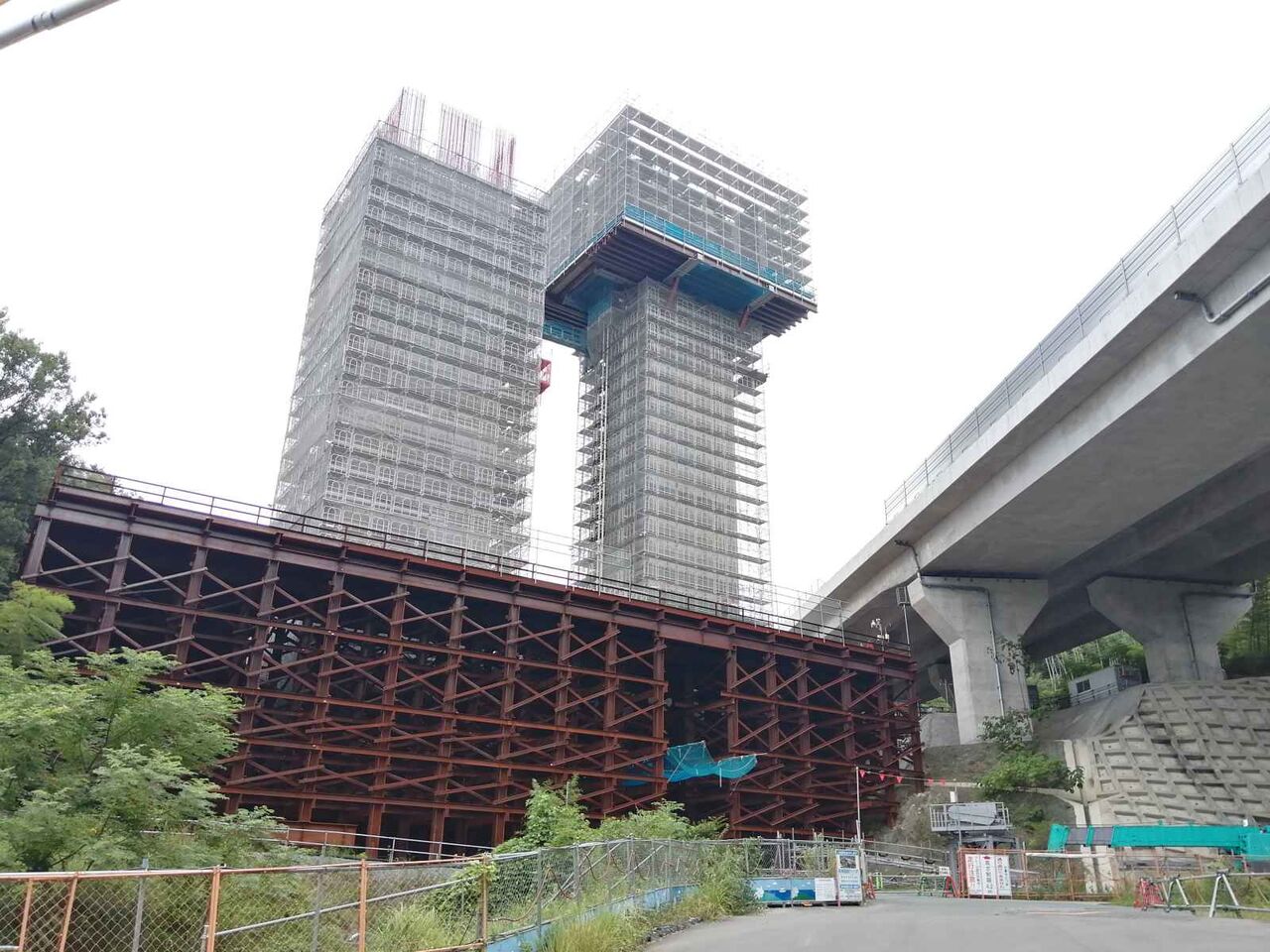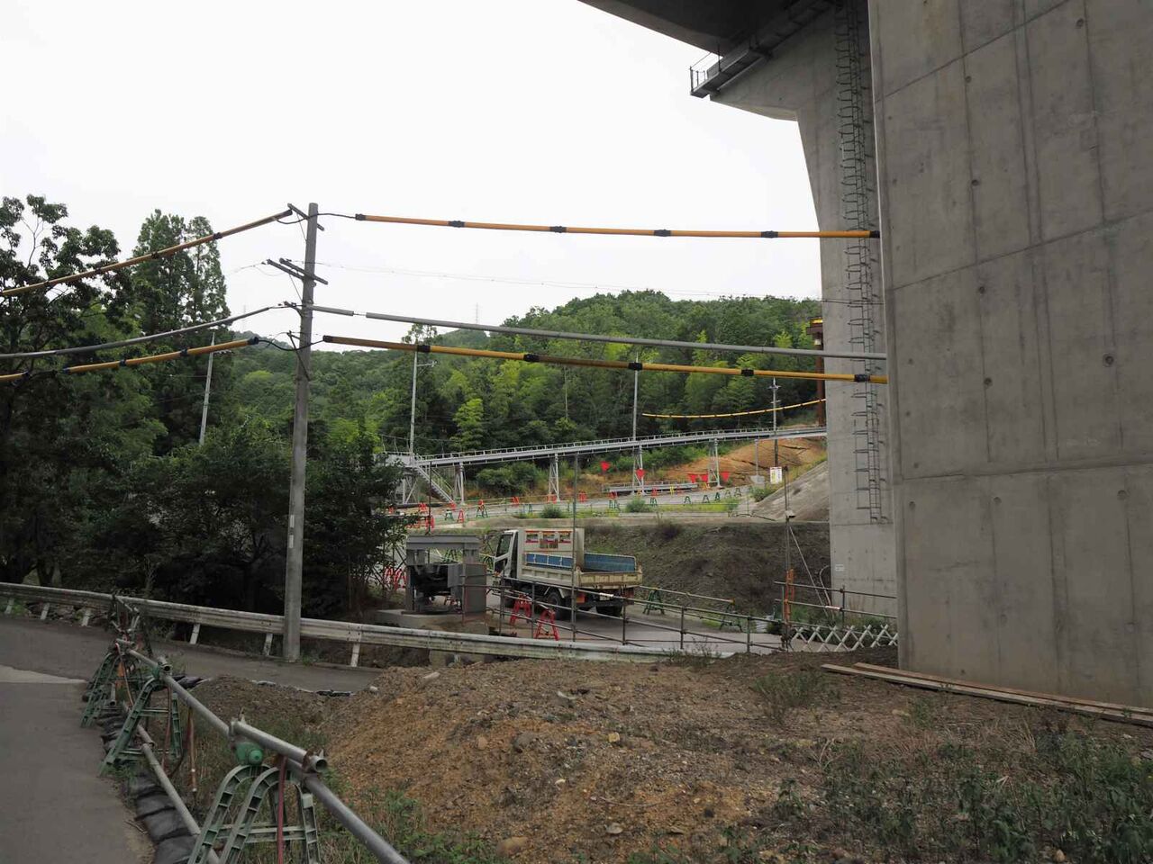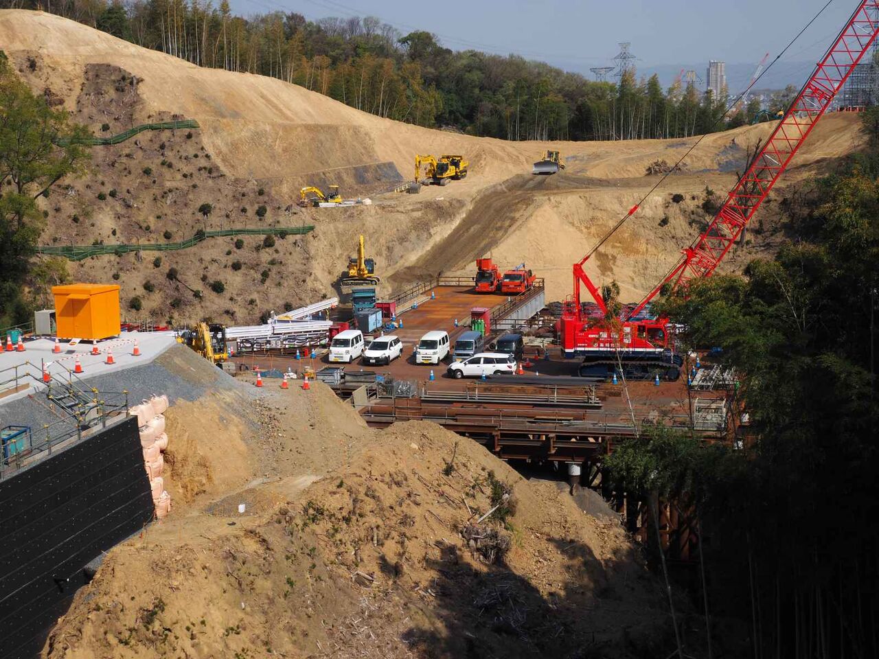 発想が貧困なのですが、清水の舞台とジオタワーに見えます。。中央の開いているところから先は川久保に行く道(新名神の側道)につながり、資材や燃料の補給コースになっているようです。橋脚から橋梁が伸びてきたらまた追記したいと思います。