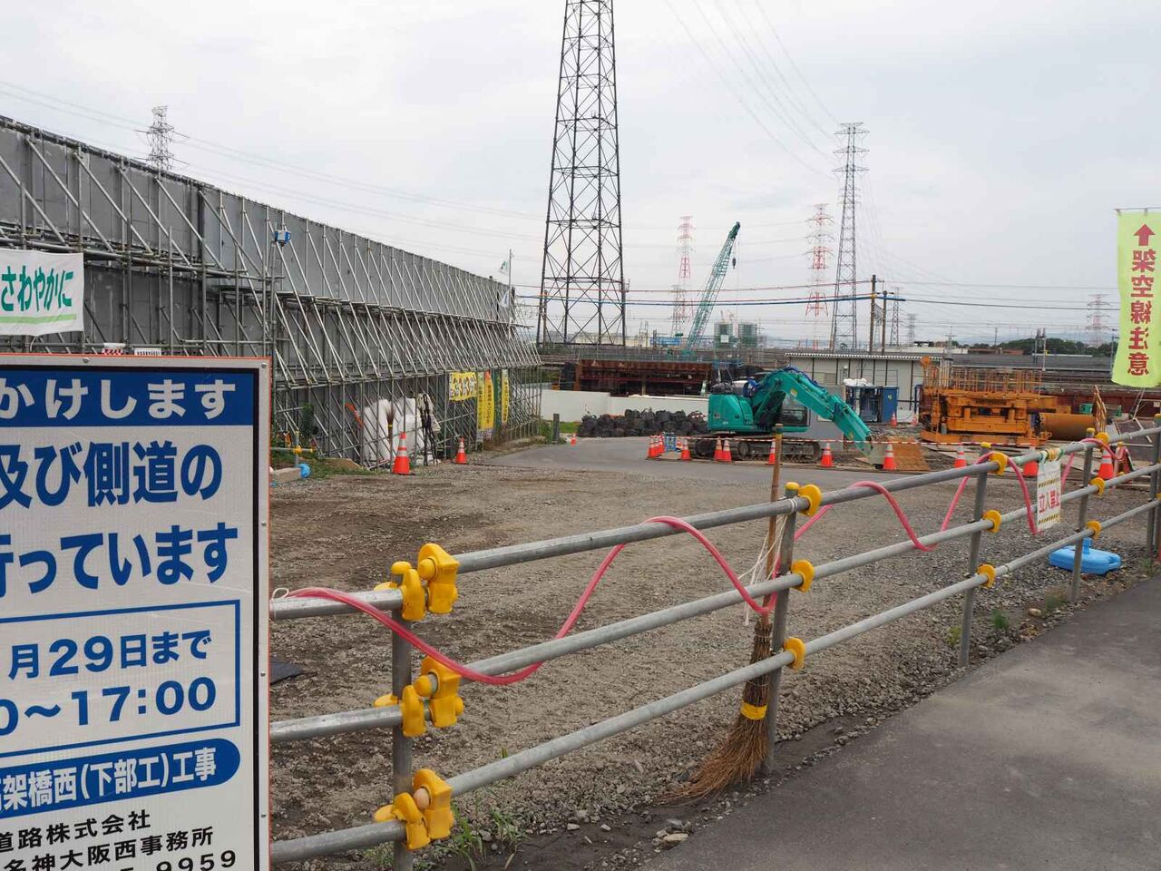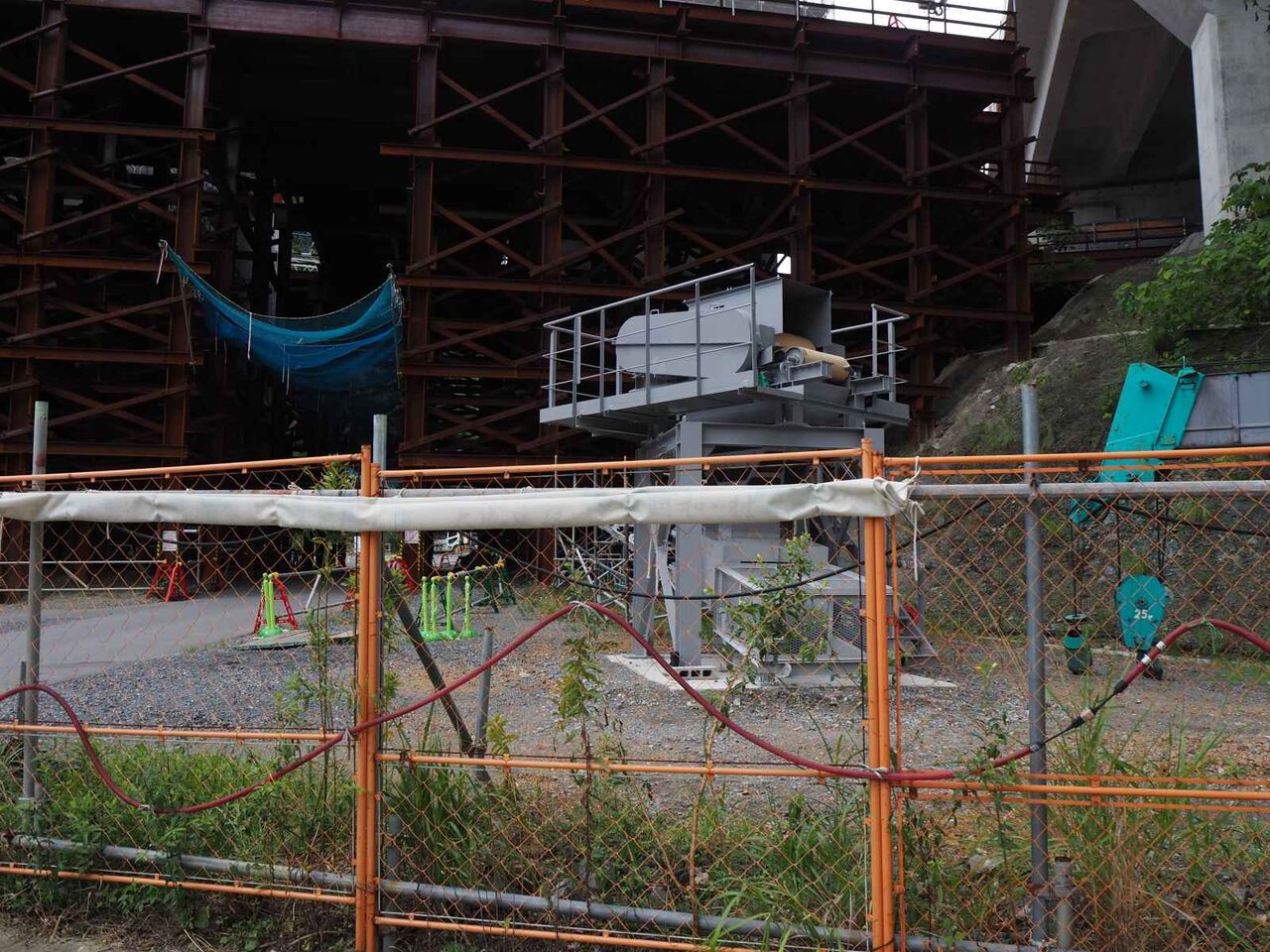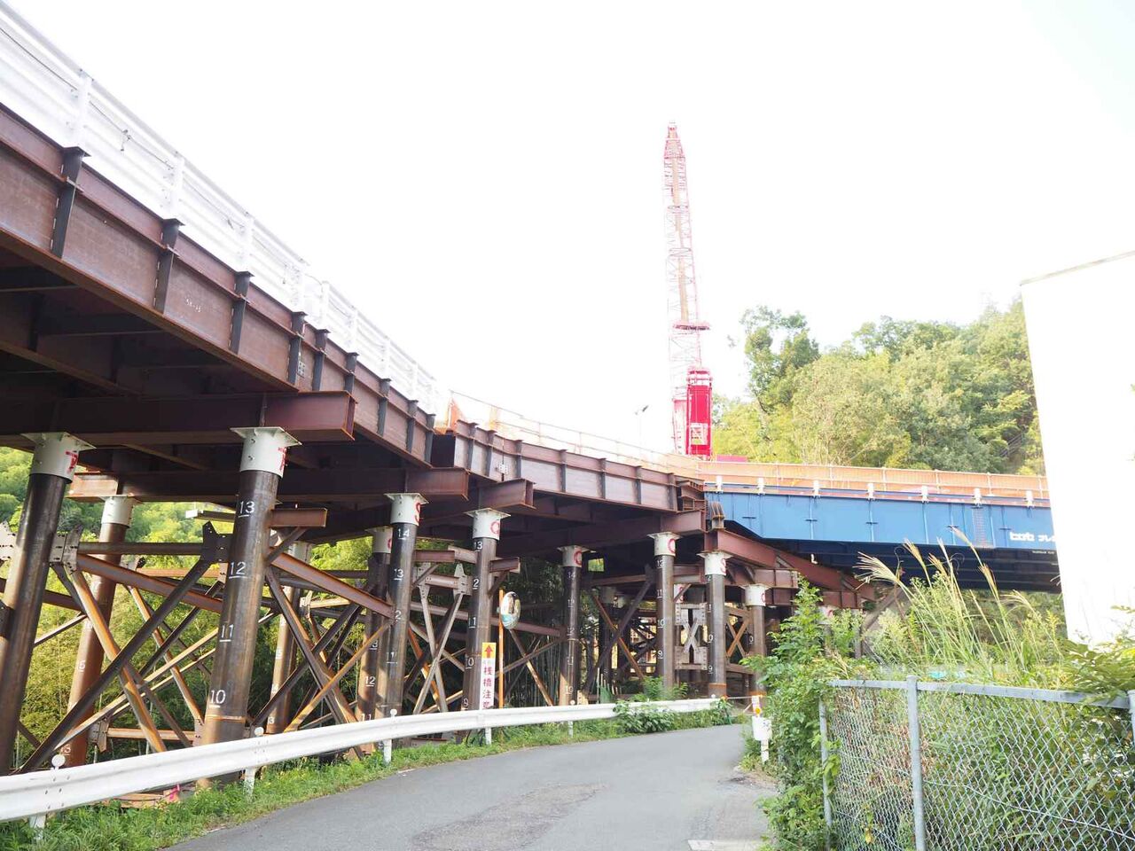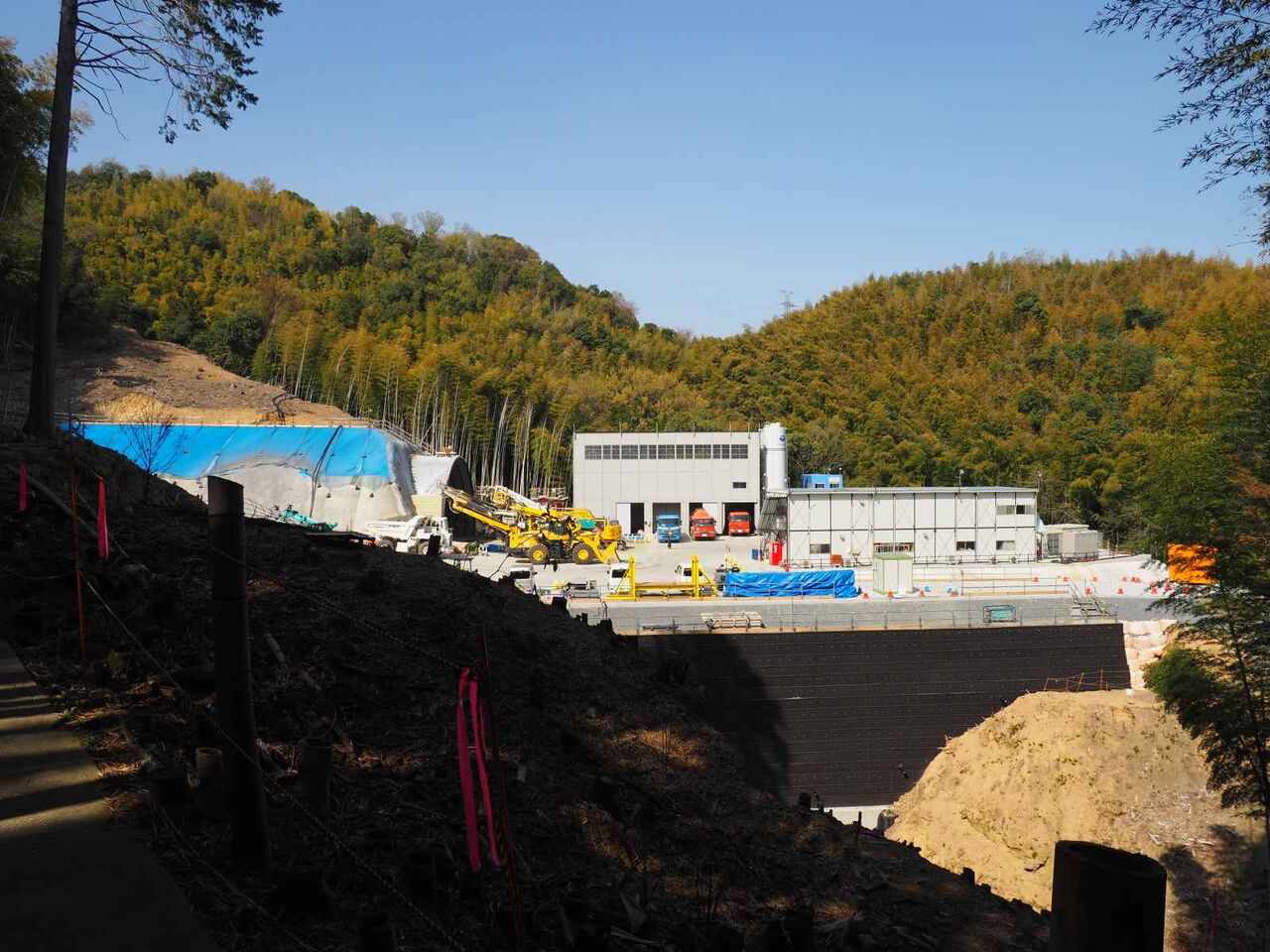 発想が貧困なのですが、清水の舞台とジオタワーに見えます。。中央の開いているところから先は川久保に行く道(新名神の側道)につながり、資材や燃料の補給コースになっているようです。橋脚から橋梁が伸びてきたらまた追記したいと思います。
