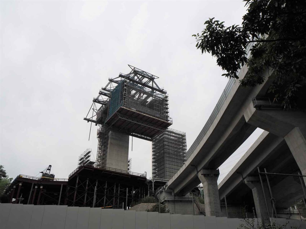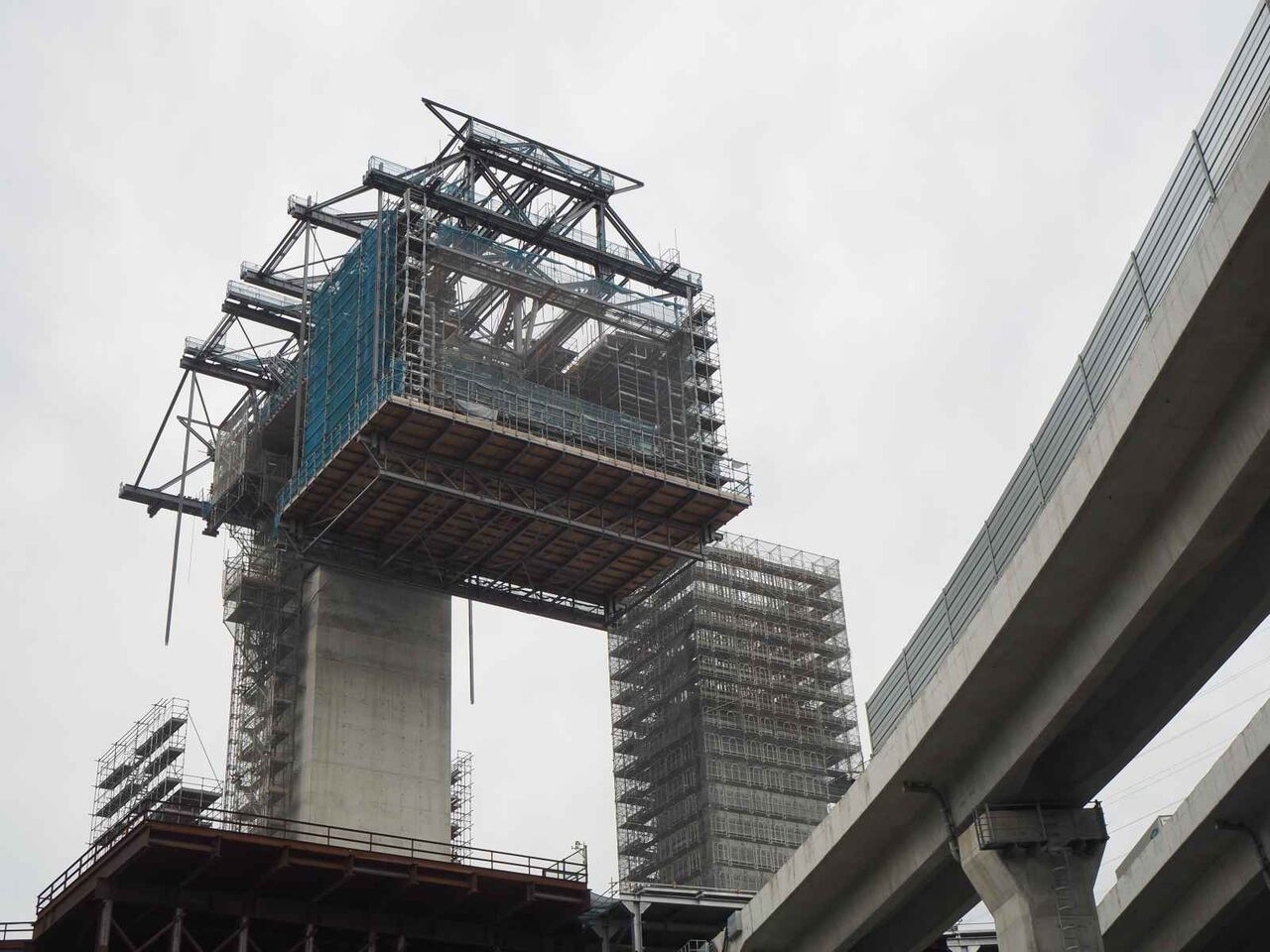 左手の橋脚が上までできてこれから両側に橋梁を伸ばしていく工事になると思われます。