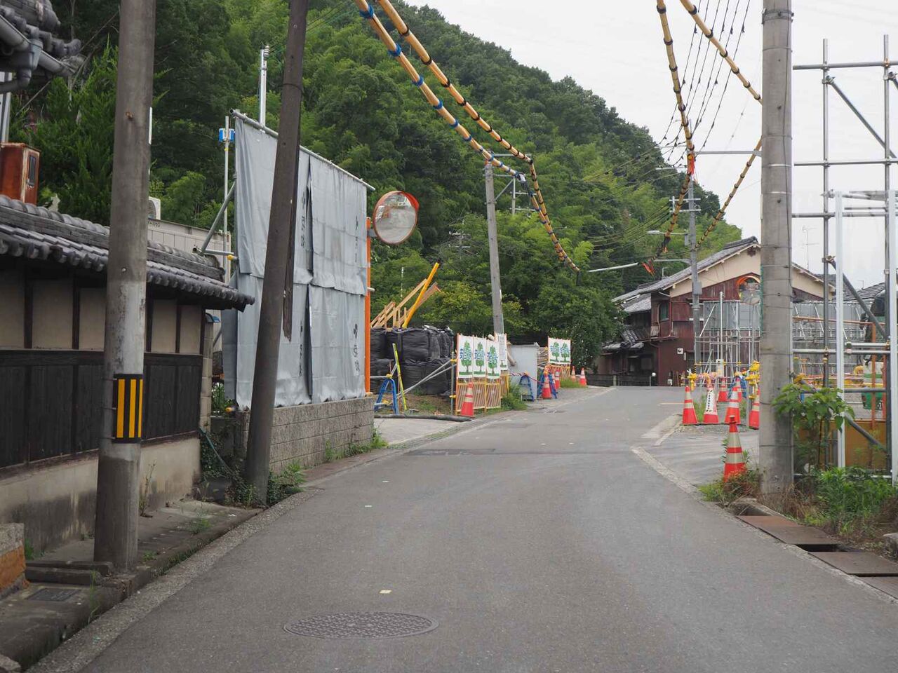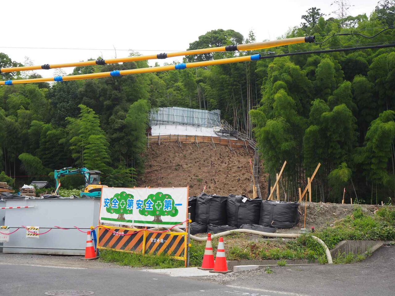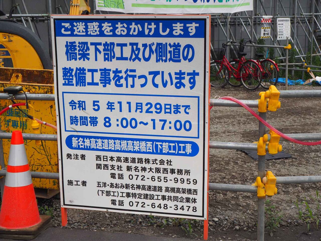 竹林の斜面が工事をされています。この西国街道を挟んで両側に橋脚ができるようで、その場所の斜面の補強がなされているようです。ここの工事は2024年(令和6年2月29日までのようです)
