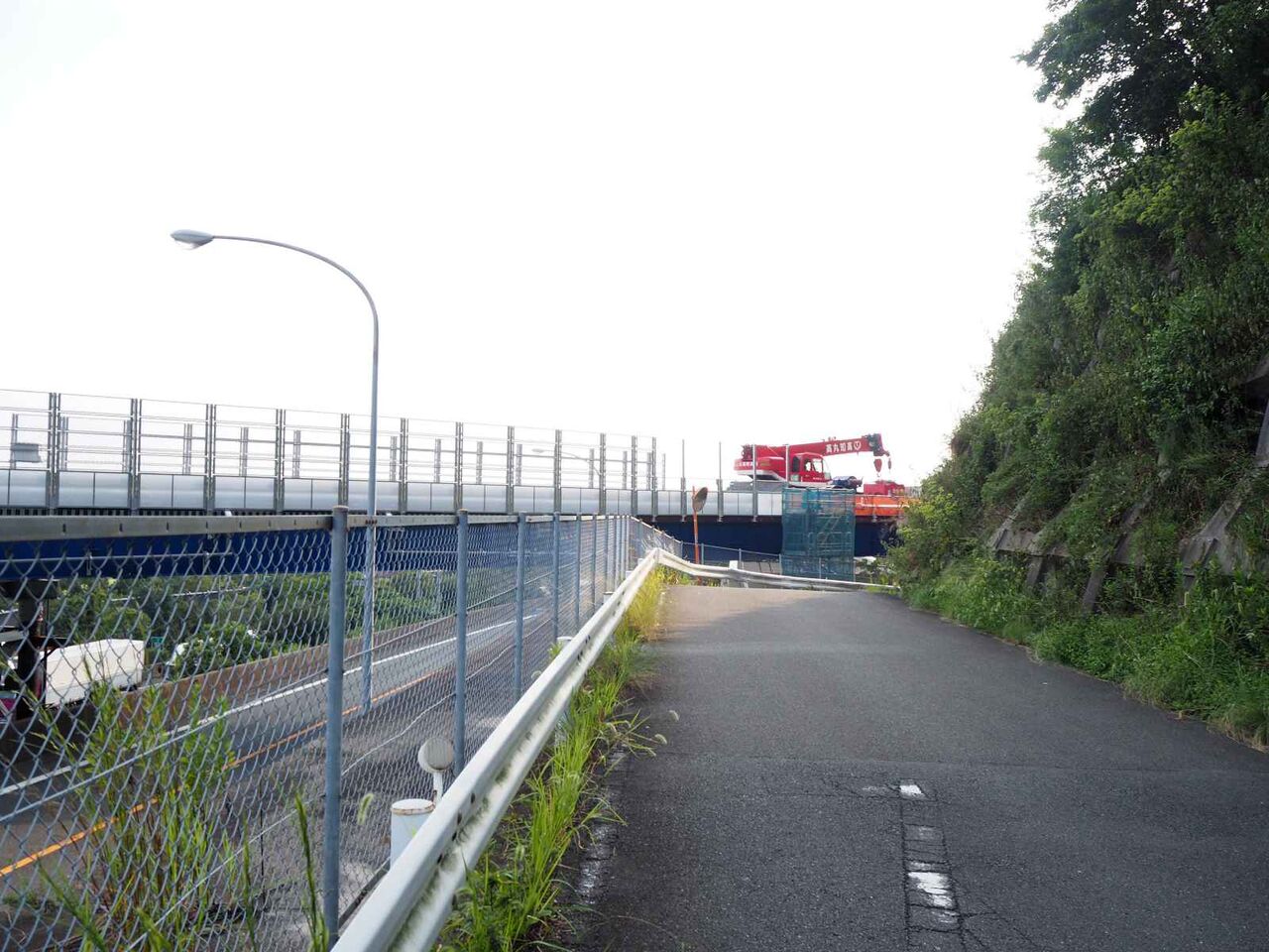 この道路の反対側もできているようです。あとは橋脚を載せる(パーツを持ってきてつないで伸ばす作業のようです)だけのようです。