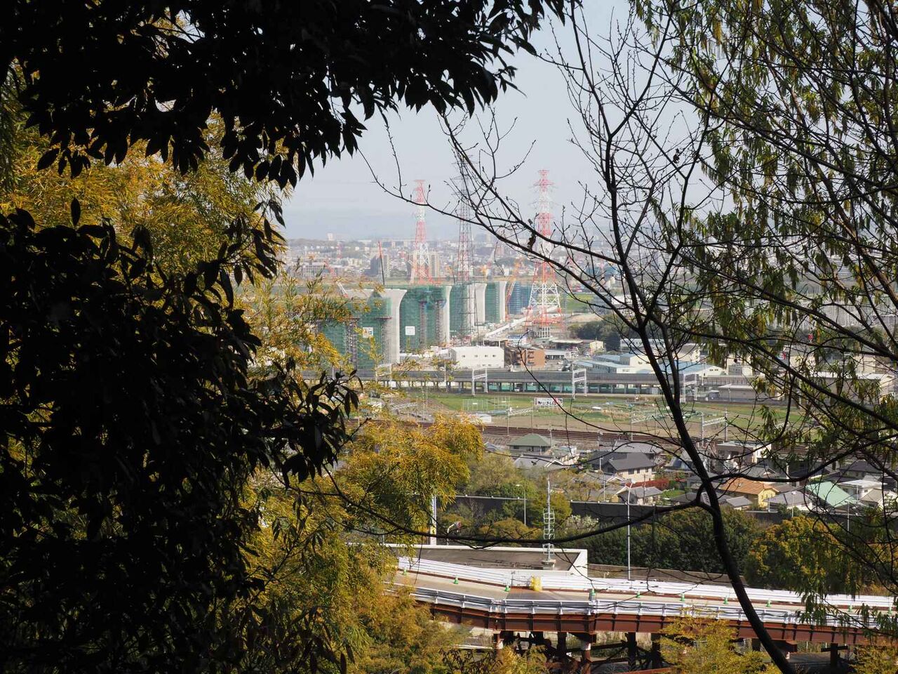 新名神 淀川橋に向かう本線工事の成合での橋脚工事のようすです。前回は4月に投稿しました。この3か月でどのくらい変化しているでしょうか?前回、どうしても清水の舞台とジオタワーに見えると書いていた橋脚は、