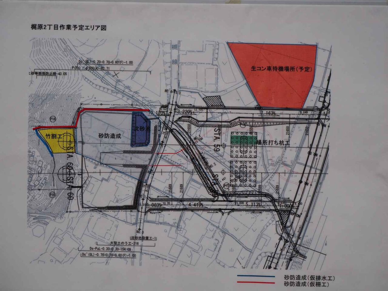 おそらく、竹林の工事は図の左側の黄色いとことと思われます。そこに橋脚ができるようです。