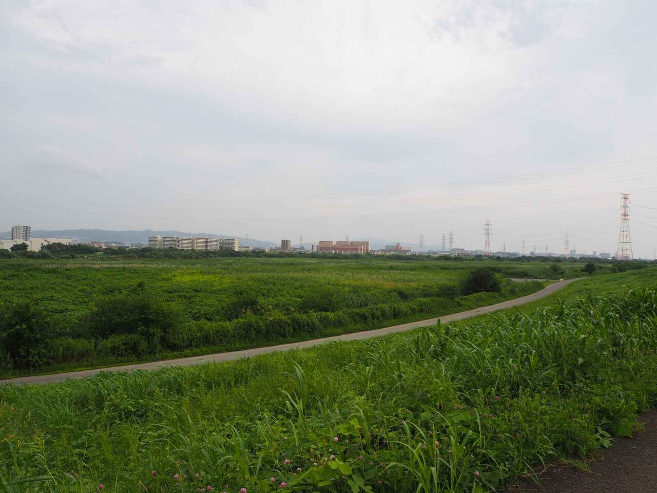 上牧の淀川堤防沿いに来ました。ここから眺めると遠くに赤いクレーンのようなものが見えますが、このあたりから新名神の淀川橋までの間、ずっと陸橋が作られます。