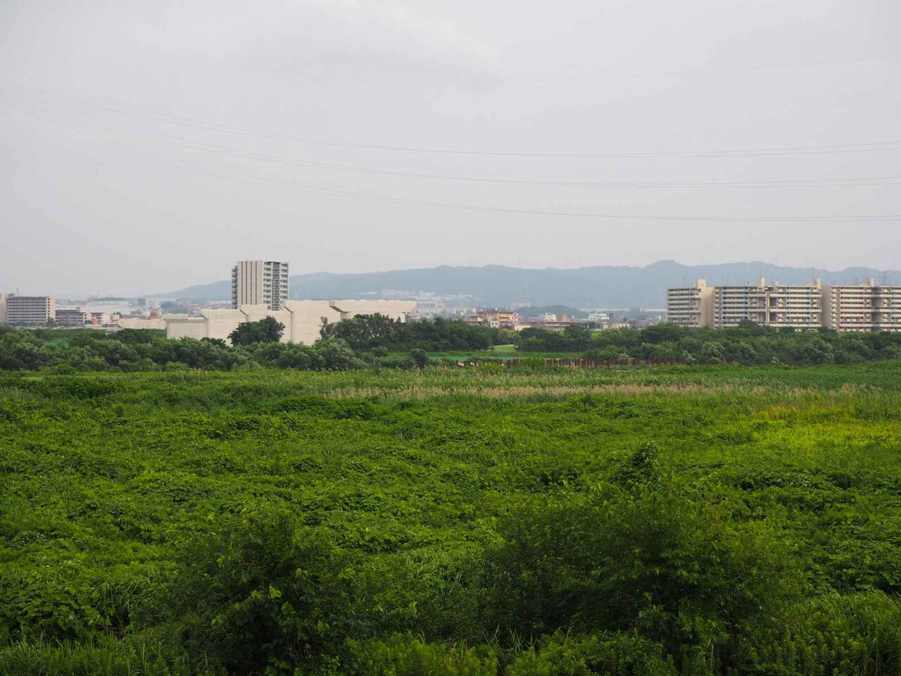 ちょうど正面の山の先右手に、淀川橋の橋脚が見えるため、こちらに