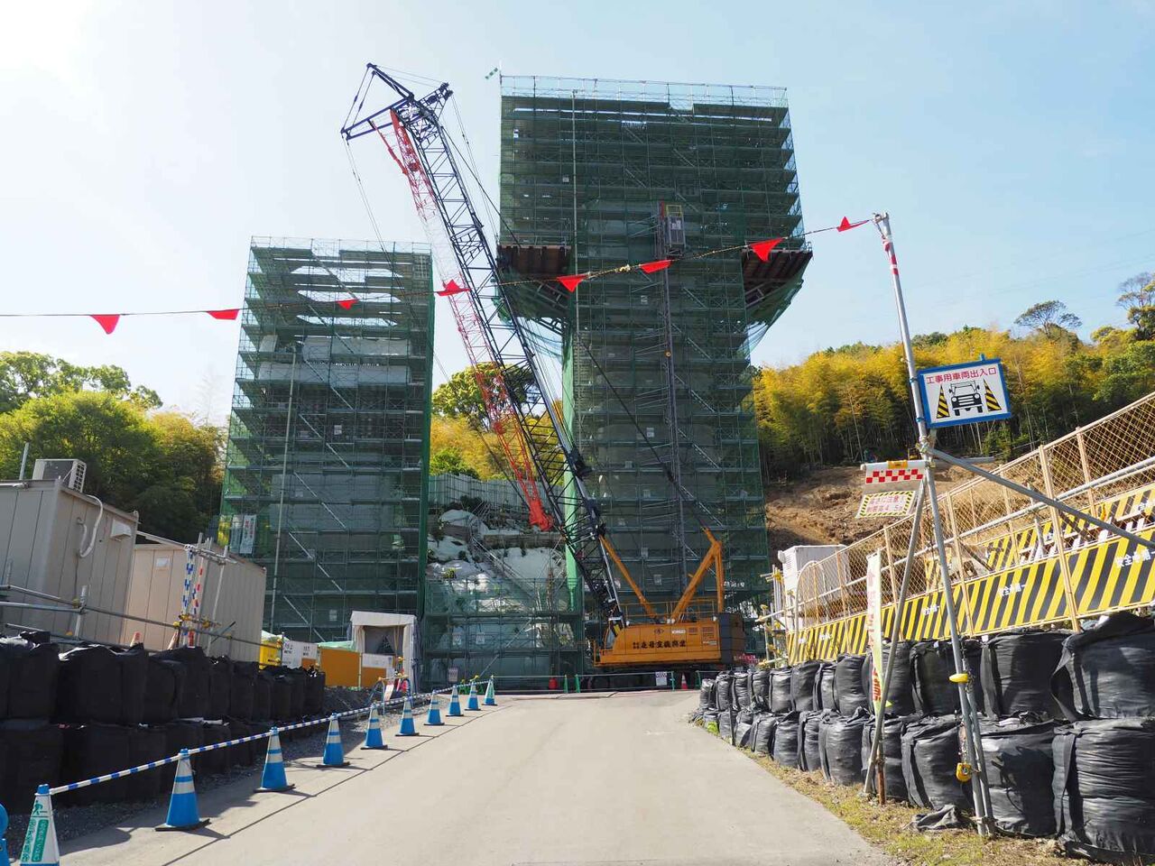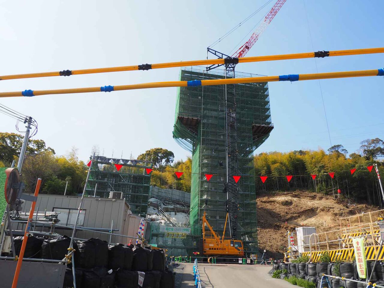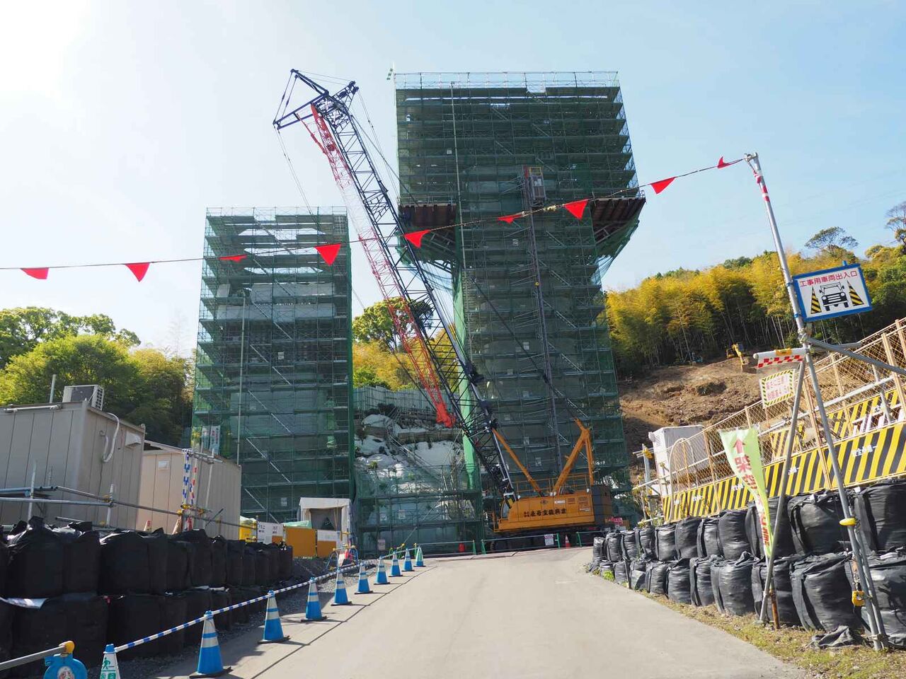 ▶新名神淀川橋工事のようす 上牧付近の橋脚工事が進んできている 梶原の山中の橋脚工事は大変なよう 2022年3月
