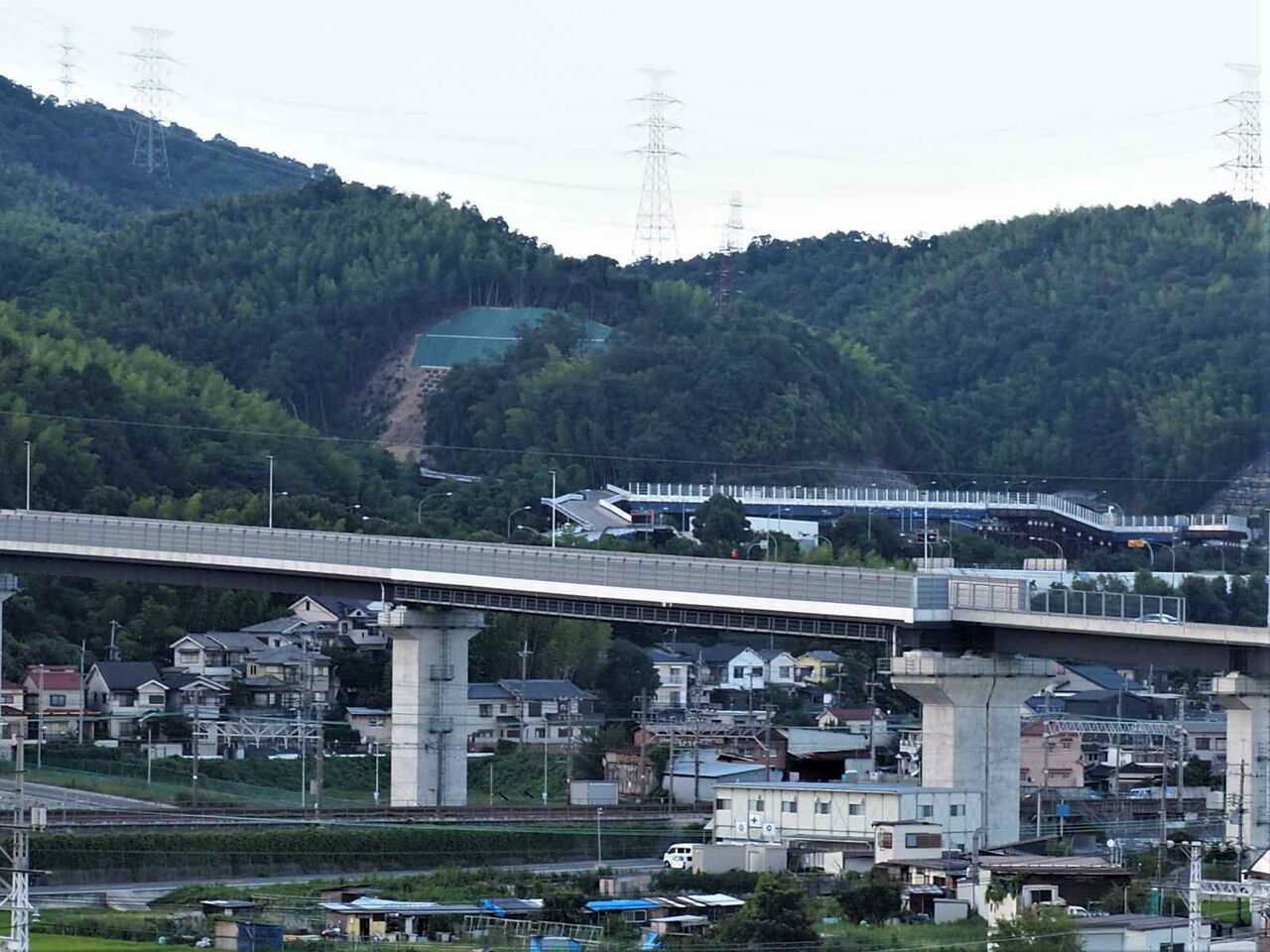 さらに左手を見てみますと、手前の東道路の奥、梶原の一乗寺の奥に、トンネルを掘っていて(東坑口)そこまで続きます。工事車両が入る桟橋が作られています。