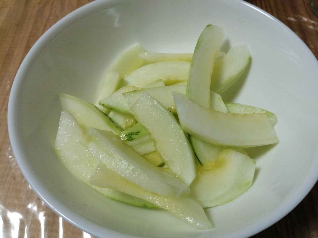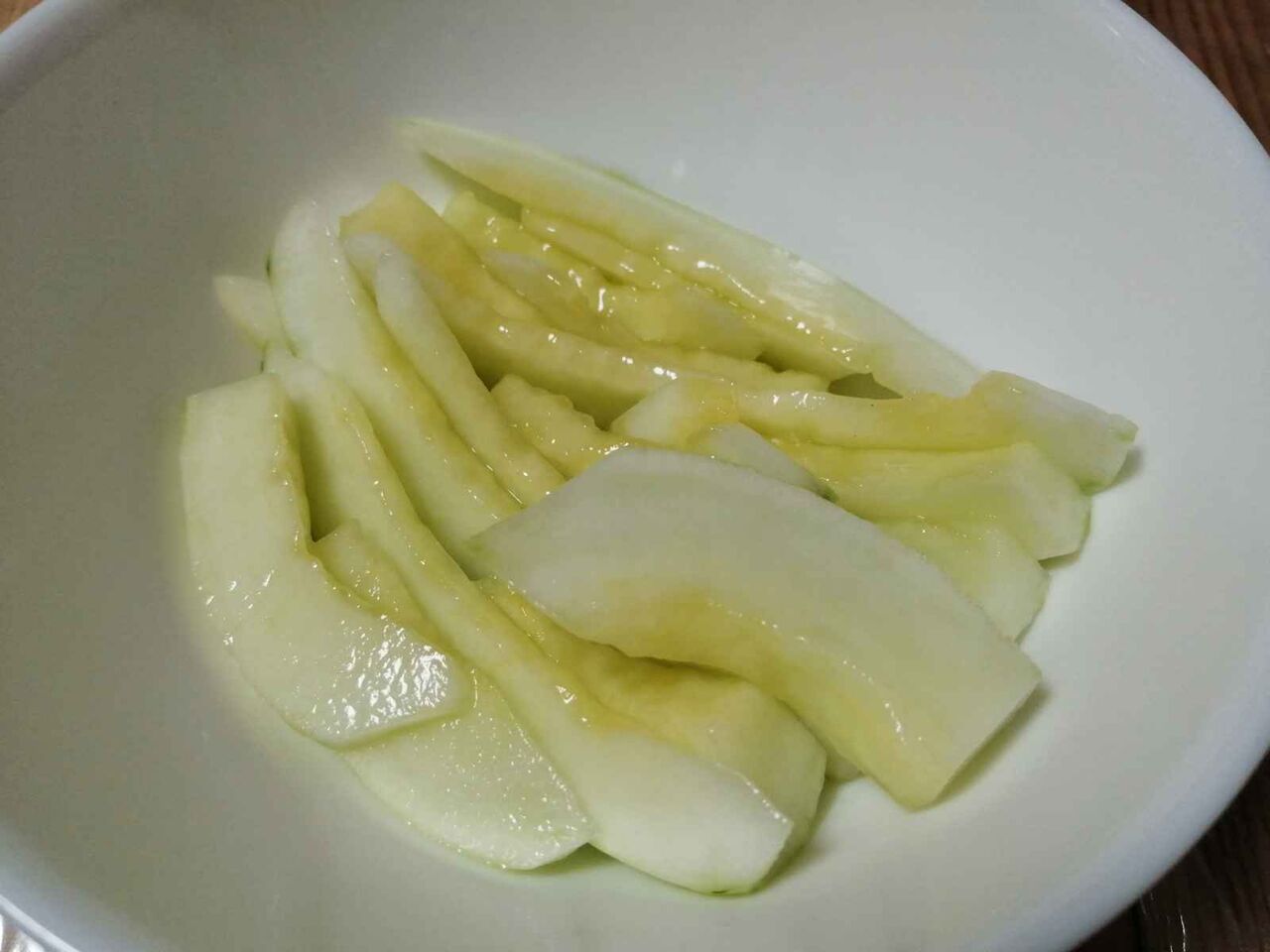 すぐやわらかくなります。マクワウリの香りがするフルーツ風味の浅漬けという感じです。とてもおいしくいただきました。大発見です。