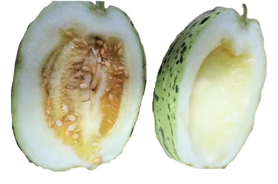 割ってみます。(マクワウリだけの写真ですが)見かけはマクワウリのそのもの。においは??少し香りはしますが。。味はなさそうです。皮を少し切って、薄く切ります。