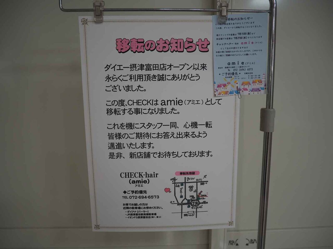 2階の北側にあったCHECKという美容室が、JR摂津富田駅前に移転されたようです。