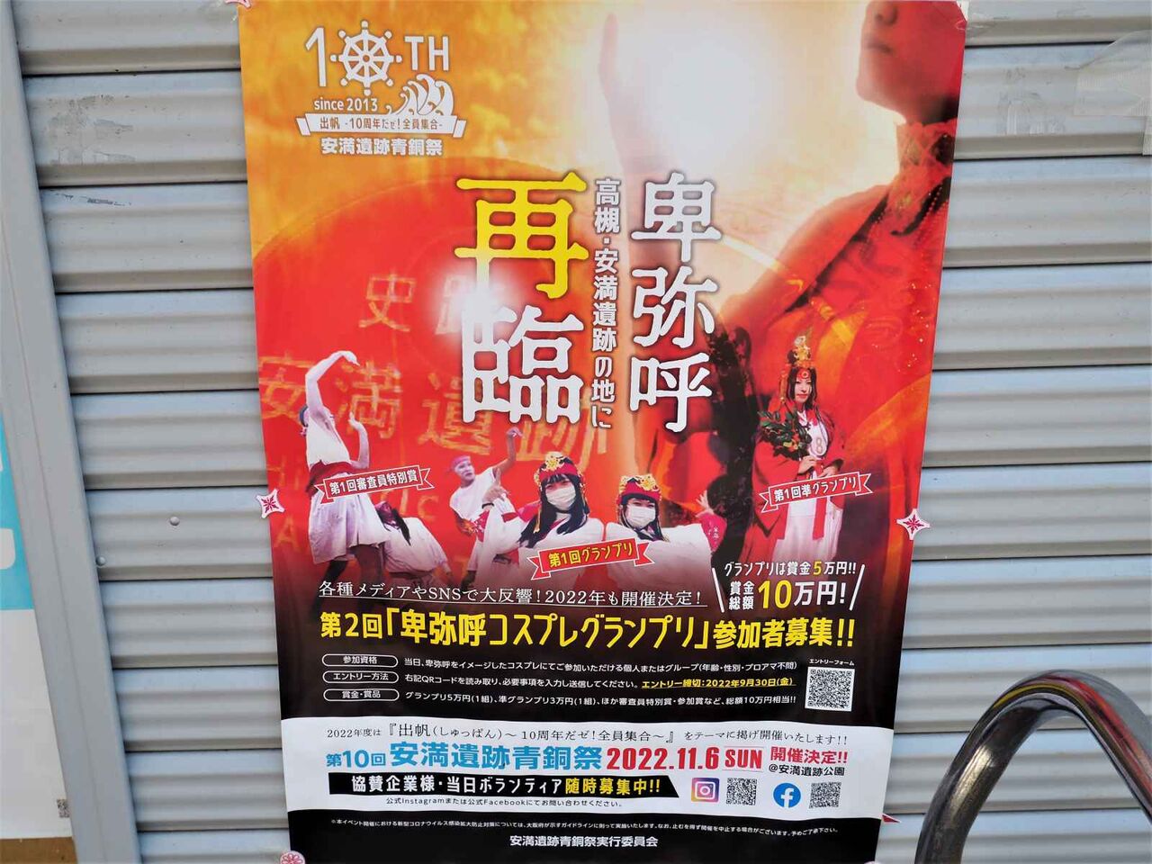 これは街かどにあったポスターです。開催時間は9時30分~17時のようです。第2回卑弥呼コスプレグランプリもあるようですね。これは応募が10月16日までに延長されているようです。もし応募してみる方はぜひ!