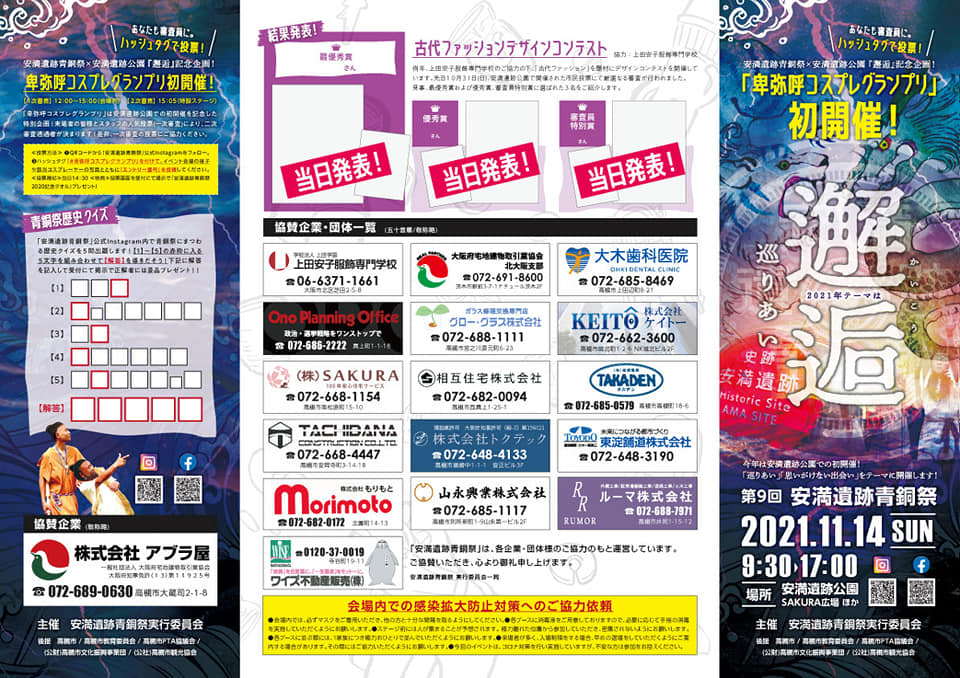 当日のイベントとしては、書と絵のパフォーマンスや、古代ファッションやデザインコンテスト、高槻ウエーブ歴史舞台、卑弥呼グランプル、人気飲食店42店舗、安満こども村のコーナーがあるようです。昨年2022年のようすも下段に参考に記載します。