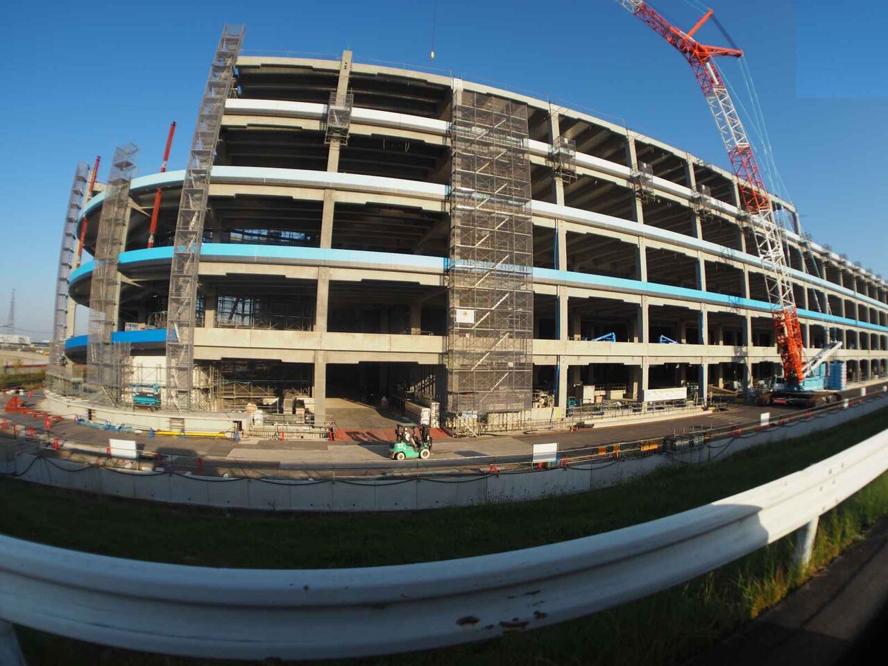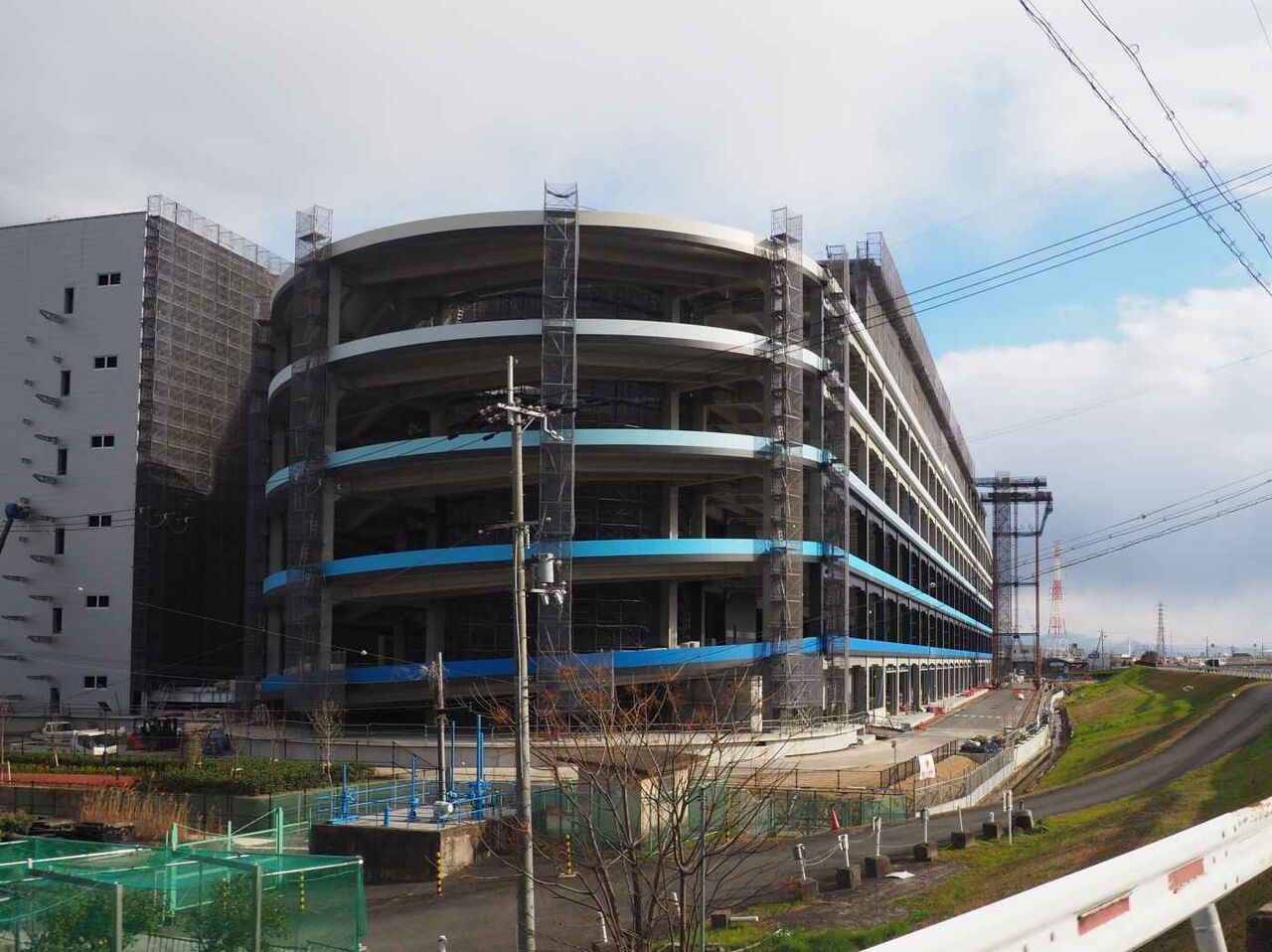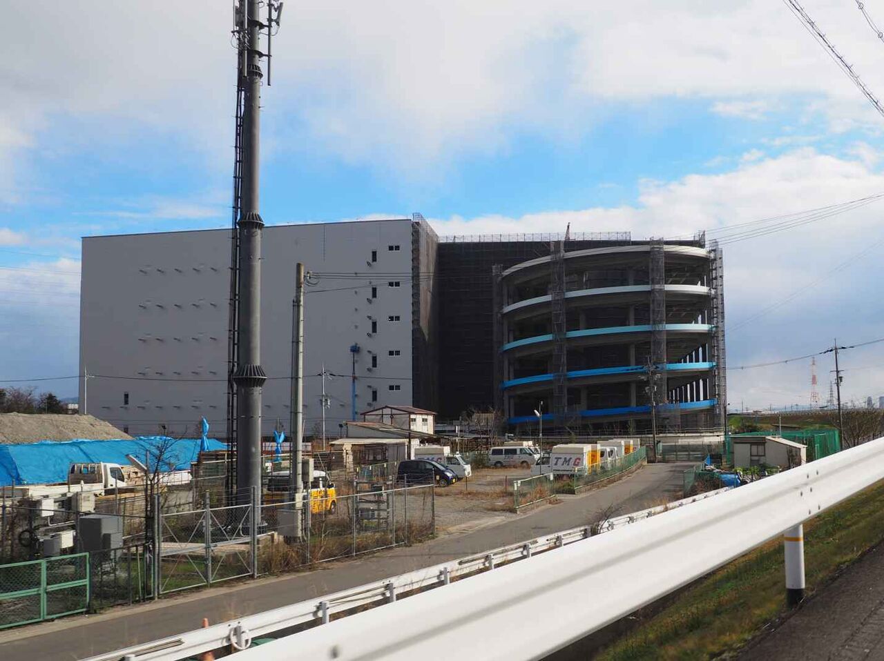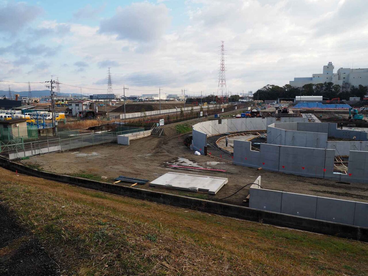このあたりは、物流倉庫ができる予定なんですが、何やら丸い建設物。らせん状に登るスロープの土台でしょうか。