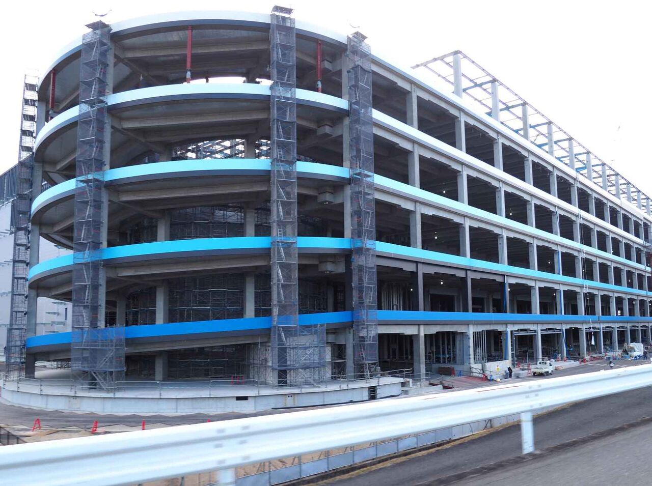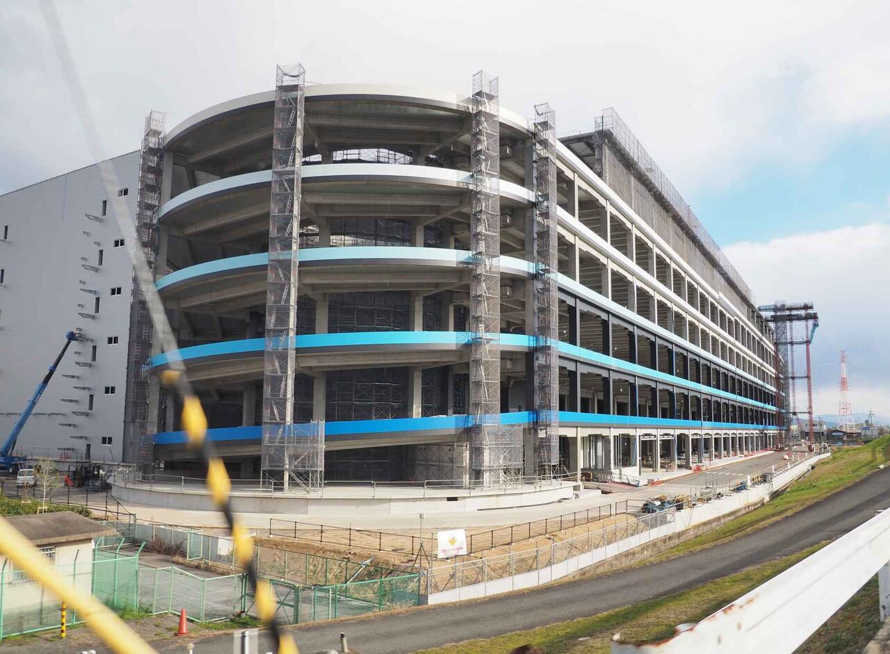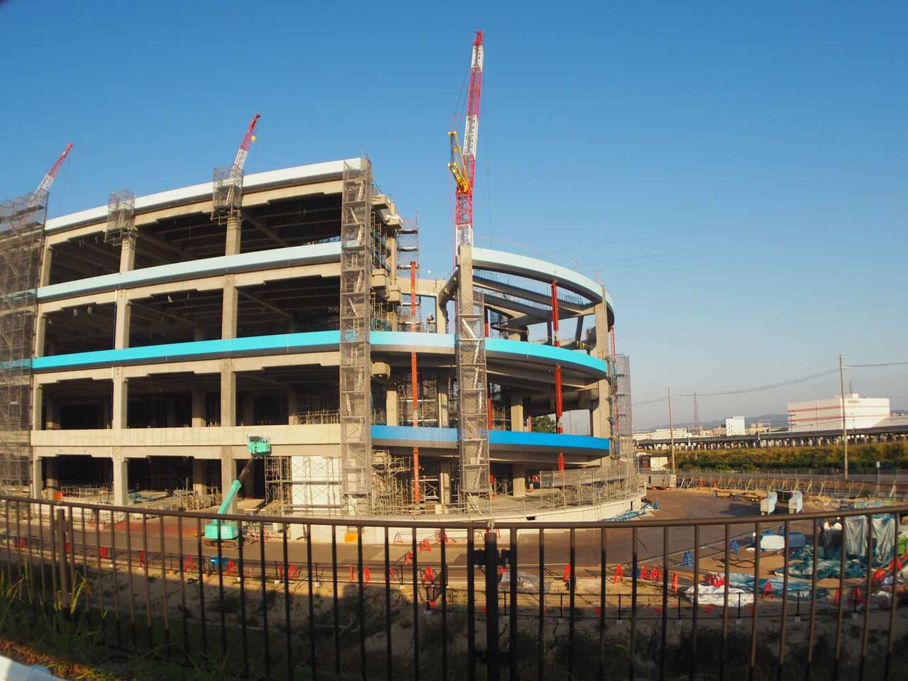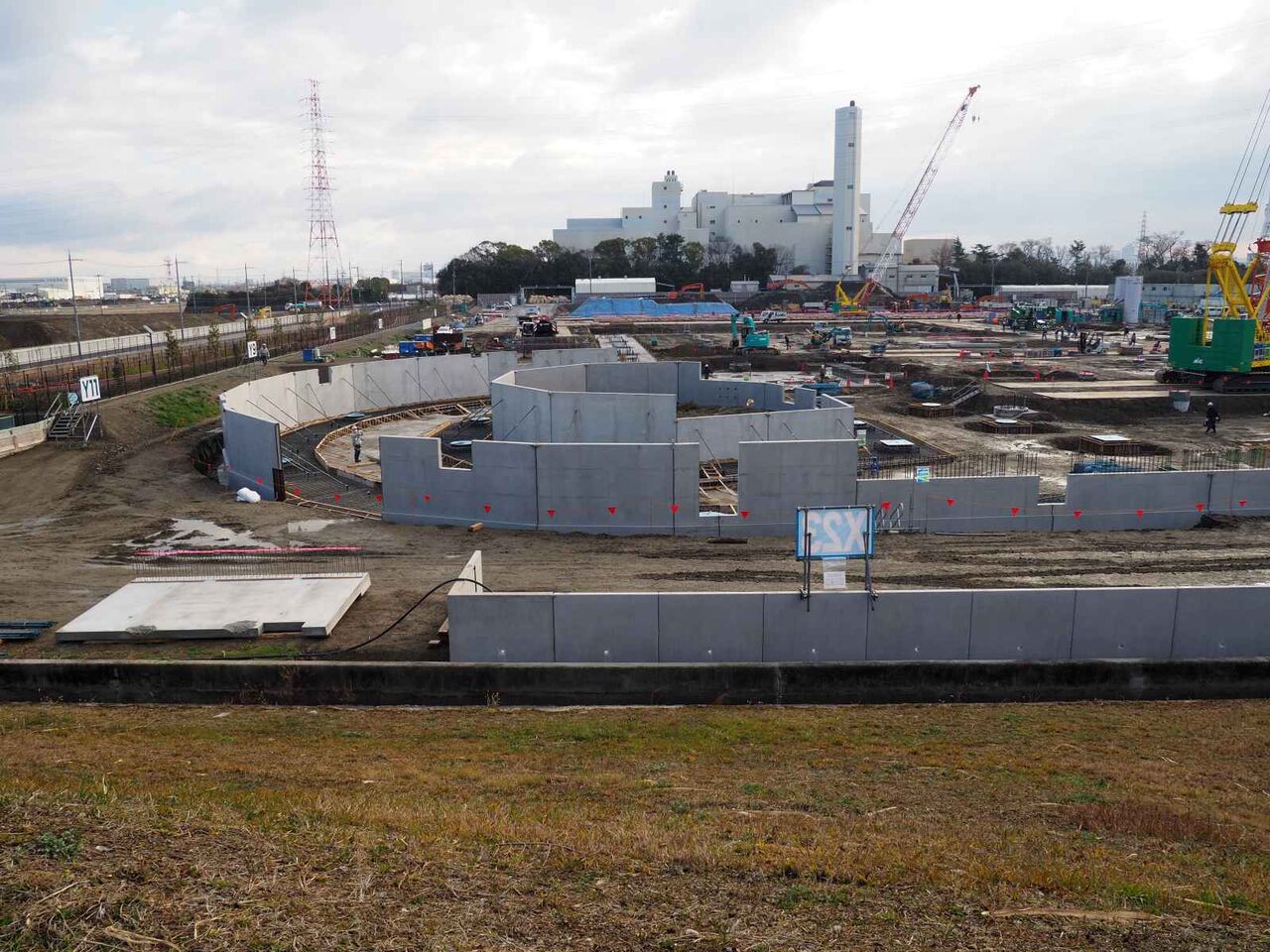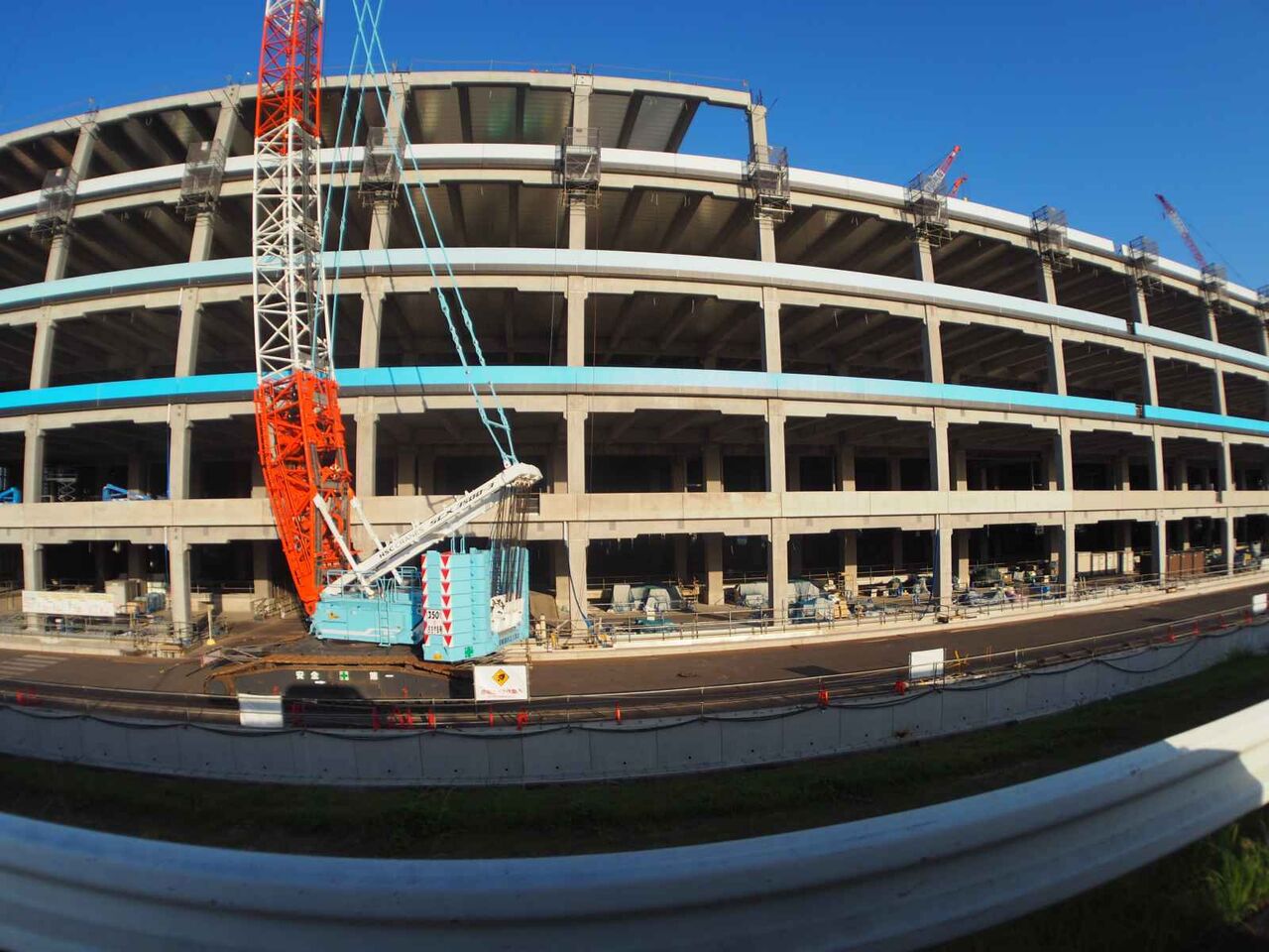 このあたりは、物流倉庫ができる予定なんですが、何やら丸い建設物。らせん状に登るスロープの土台でしょうか。