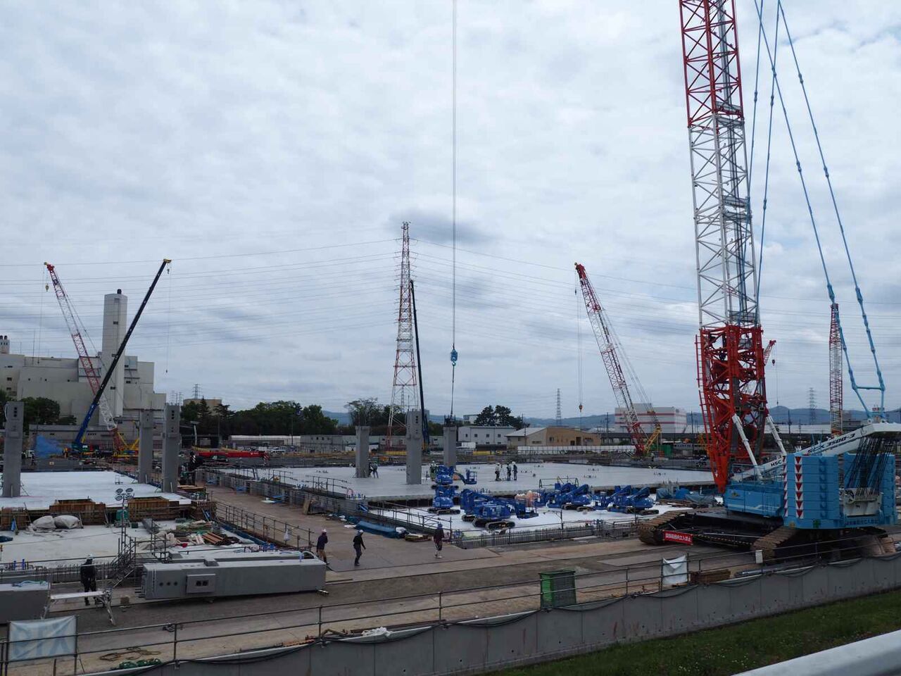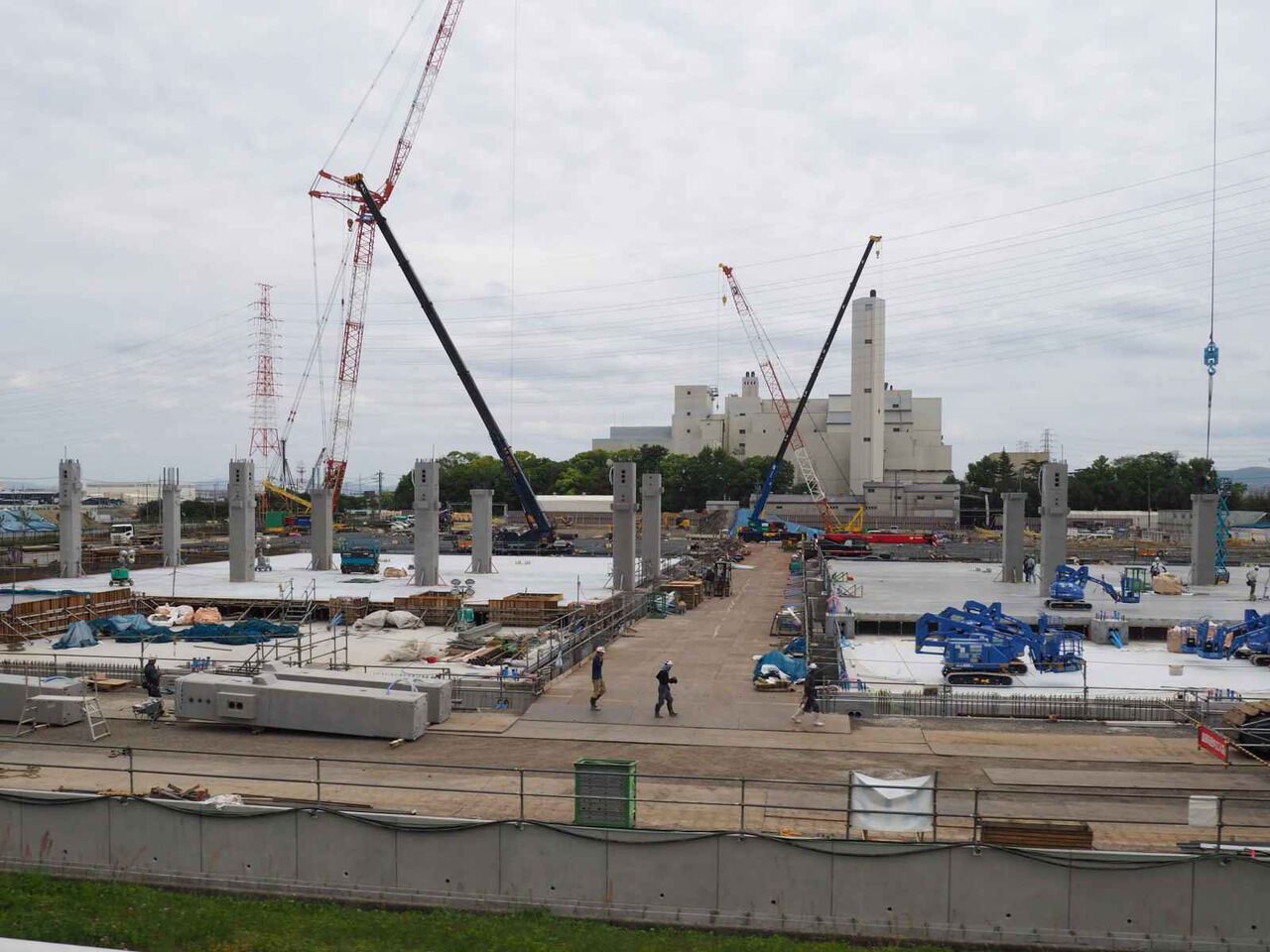 柱は部品として持ってきているのでしょうか?右側にある巨大クレーンはいままで見かけたことがありません。高速道路のクレーンでもここまで大きくなかったのでは?